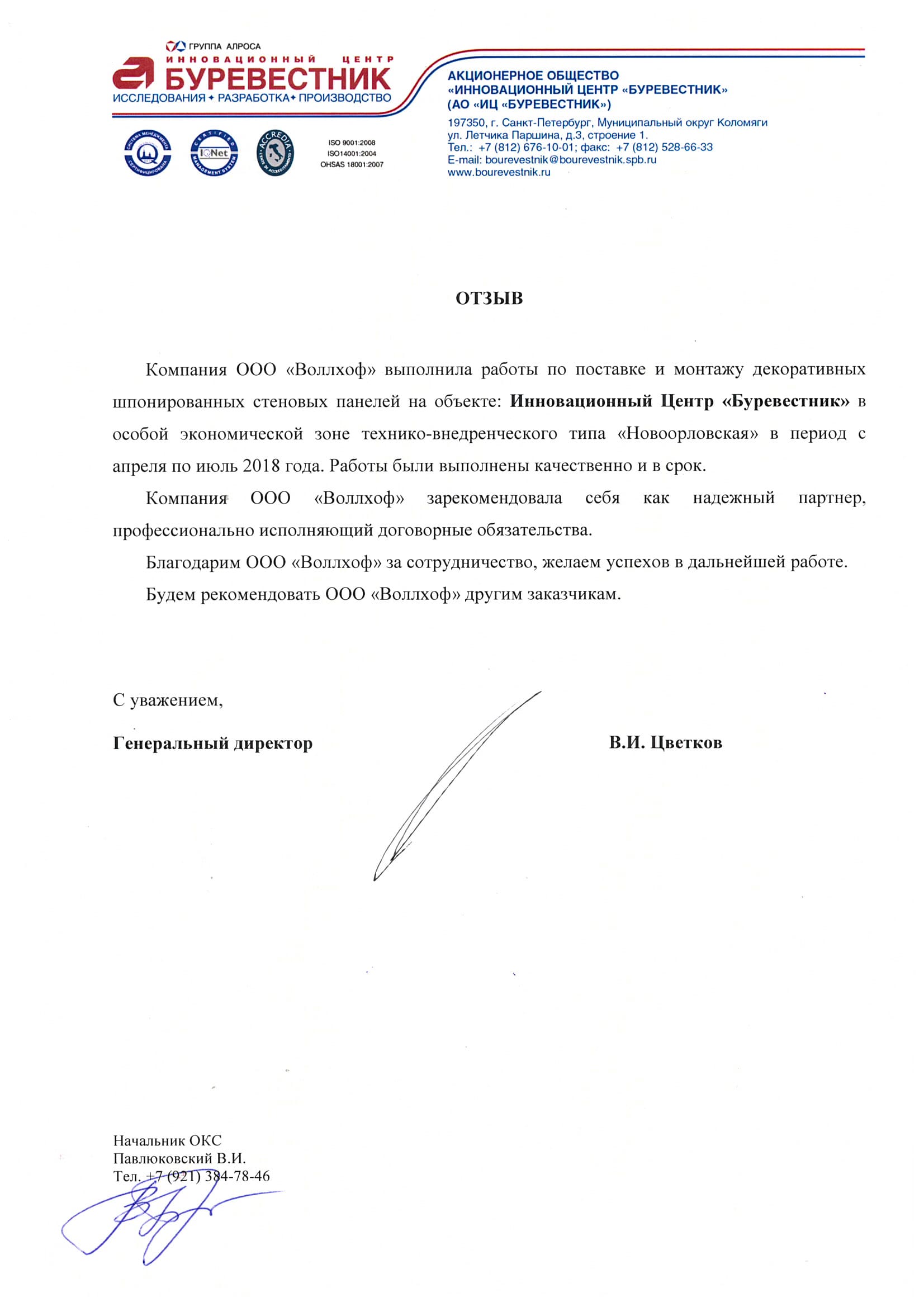 Компания ООО «Воллхоф» выполнила работы по поставке и монтажу декоративных шпонированных стеновых панелей на объекте: Инновационный центр «Буревестник» в особой экономической зоне технико-внедренческого типа «Новоорловская» в период с апреля по июль 2018 года. Работы были выполнены качественно и в срок.