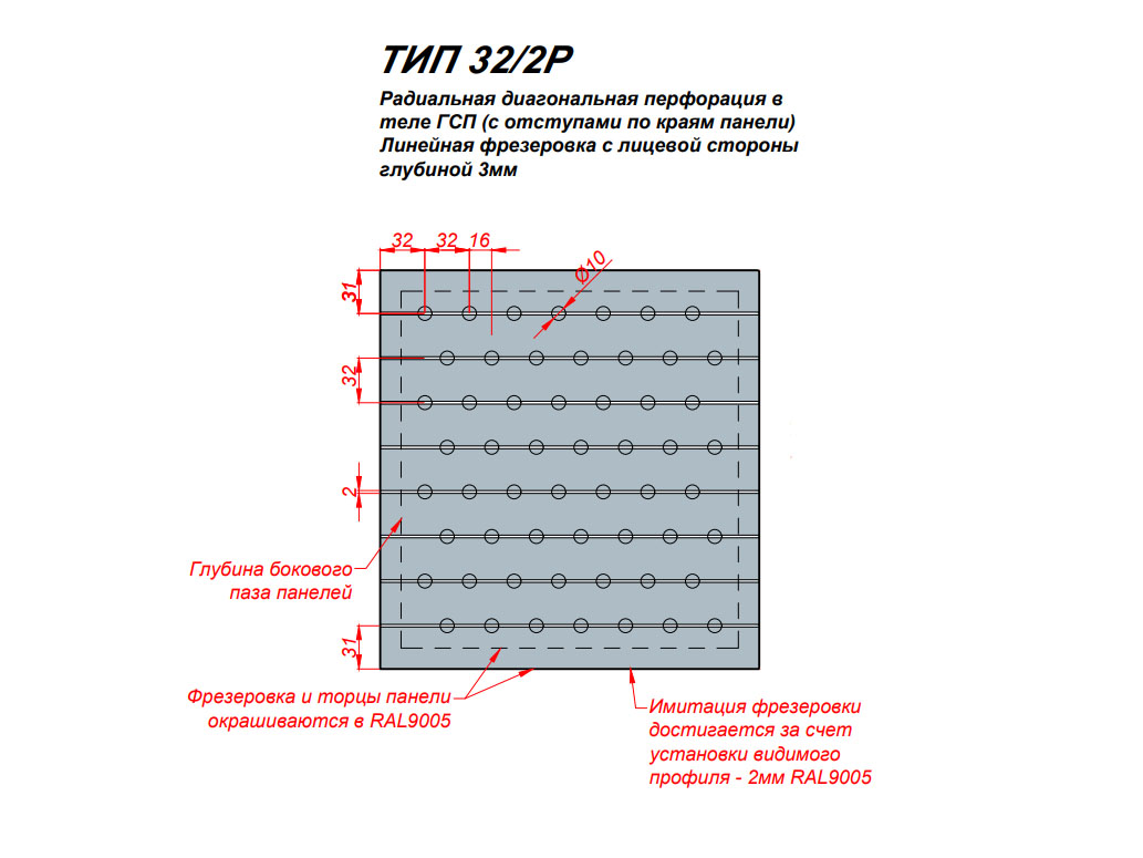 • Тип: 32/2P линейная перфорация (линейная фрезеровка с лицевой стороны), радиальная перфорация в теле ГСП