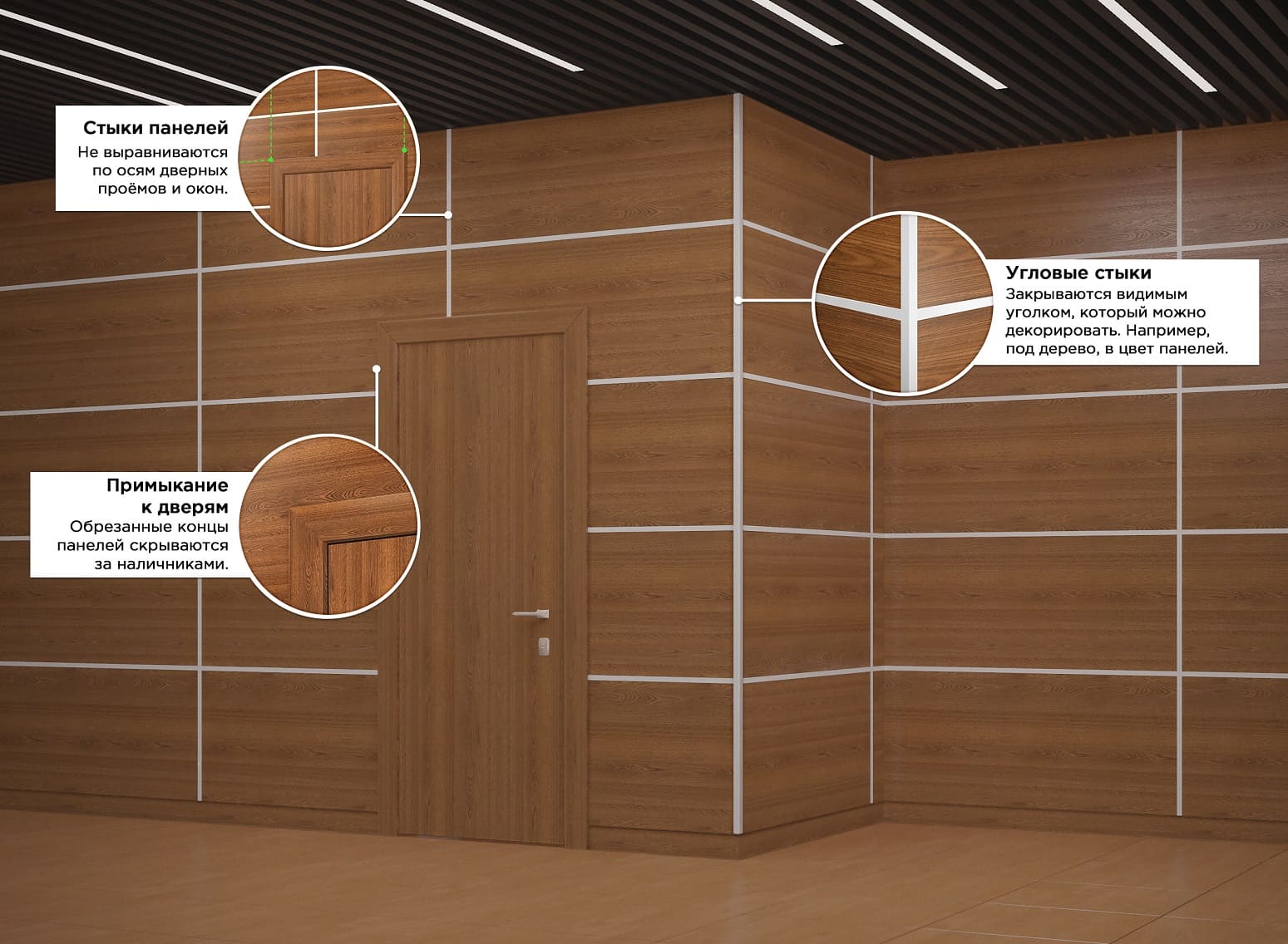 Выбор способа стыковки с полом определяется функциональным назначением помещения. Если помещение с высокой проходимостью, подразумевающее частые влажные уборки - поднимайте панели выше от пола (вариант 6) или защищайте нижний край профилем (вариант 4).