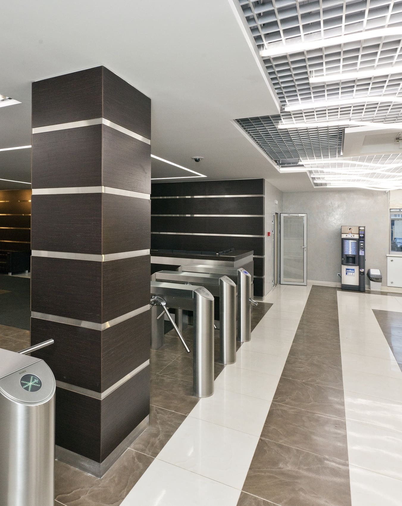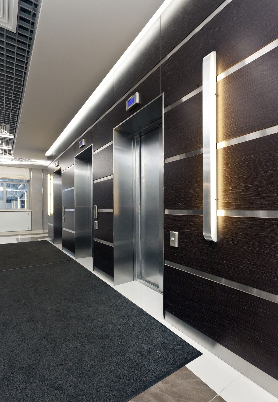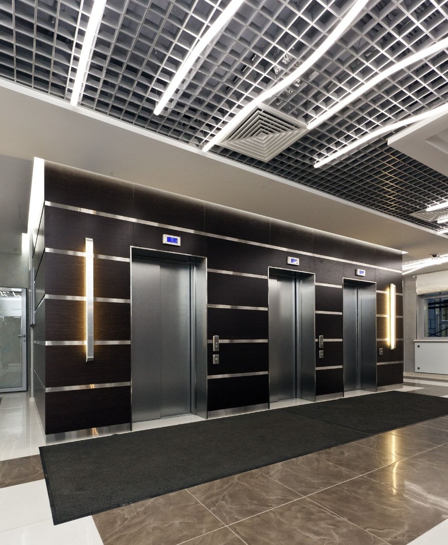 Тип панелей: Wallhof Wood Fineline. Отделка: шпон Fineline Венге. Между панелями вставки из нержавеющей стали, шириной 50 мм. Отделаны зоны лифтов, колонны, ресепшн. В проекте использовано более 20 типоразмеров панелей.