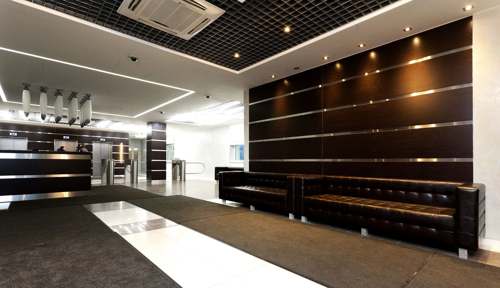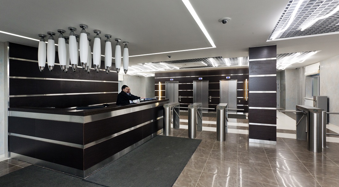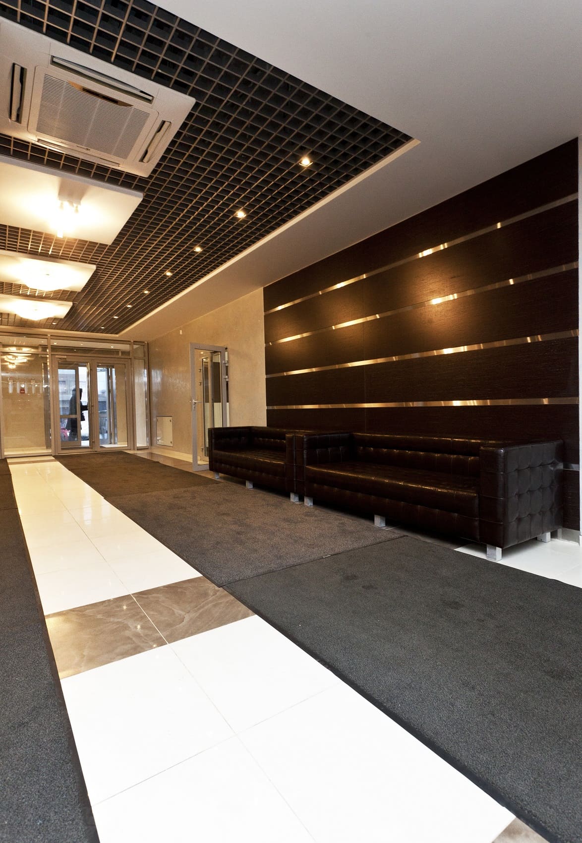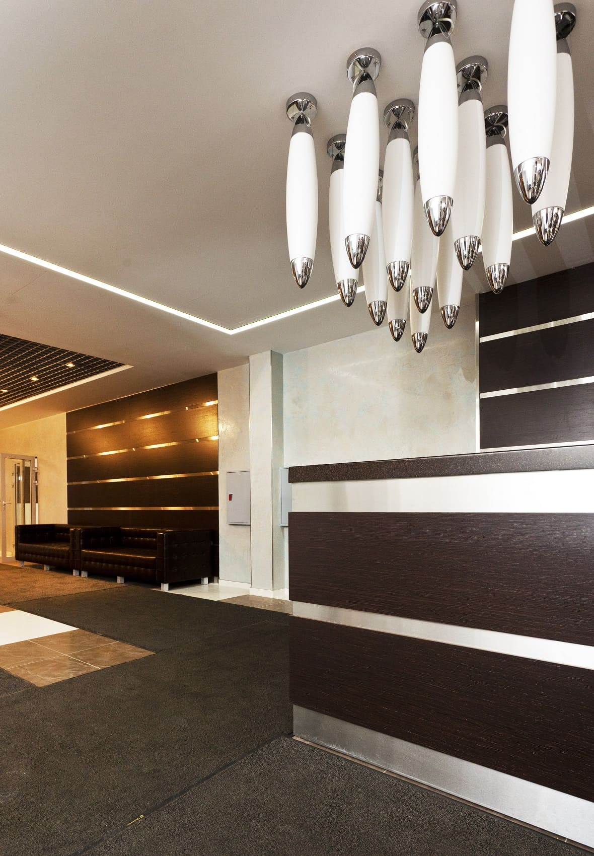 Тип панелей: Wallhof Wood Fineline. Отделка: шпон Fineline Венге. Между панелями вставки из нержавеющей стали, шириной 50 мм. Отделаны зоны лифтов, колонны, ресепшн. В проекте использовано более 20 типоразмеров панелей.