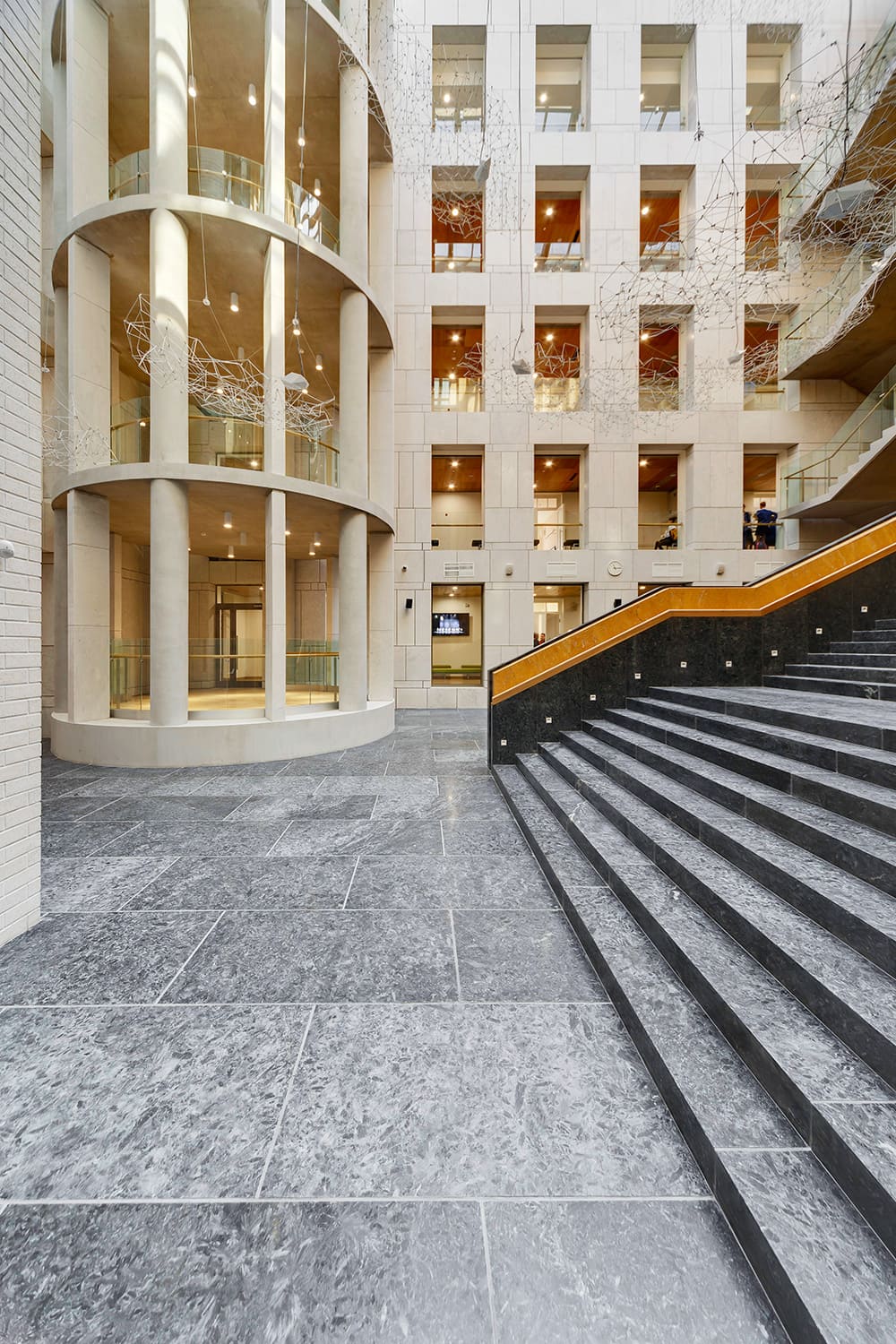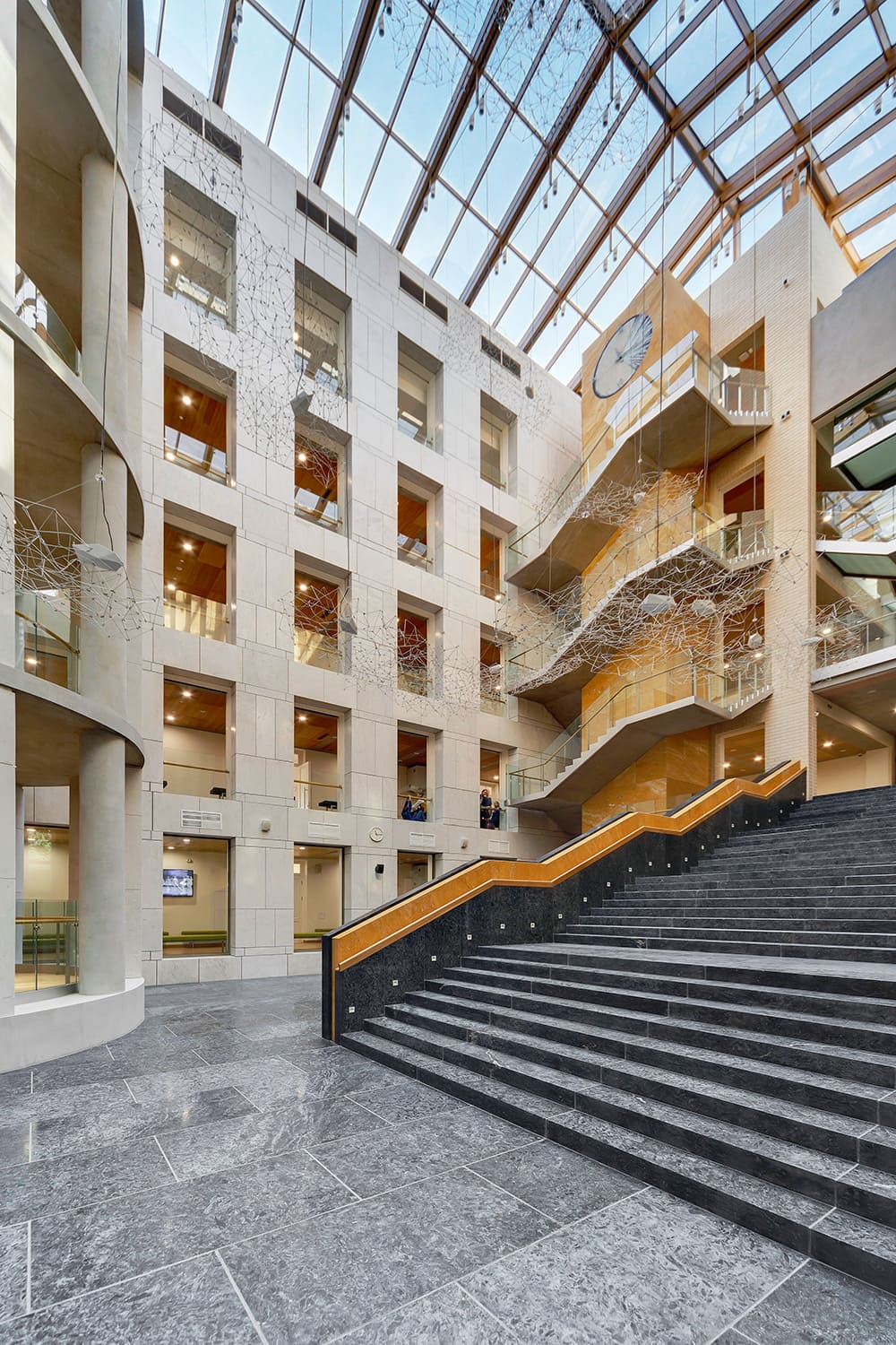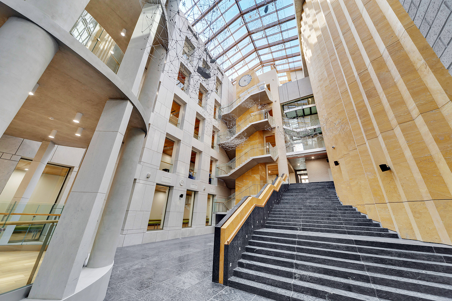 Шпонированные панели КМ-1 Wallhof Wood™ на потолке это не только эстетика, но и отличная шумо- и теплоизоляция. Именно поэтому архитекторами было принято решение применить шпонированные потолочные панели в коридорах и МОПах академии.