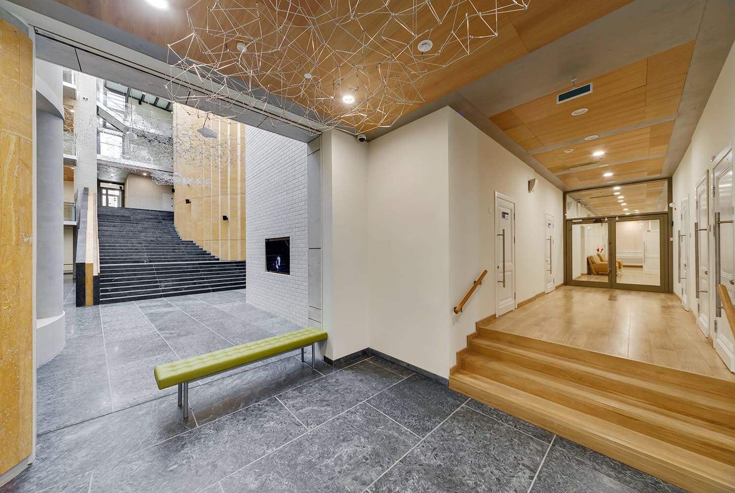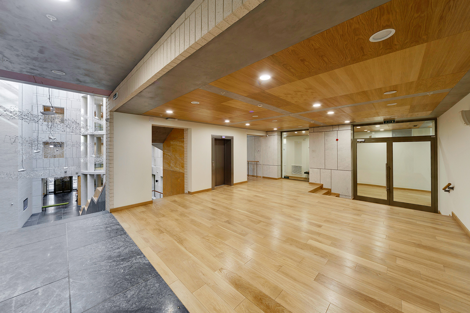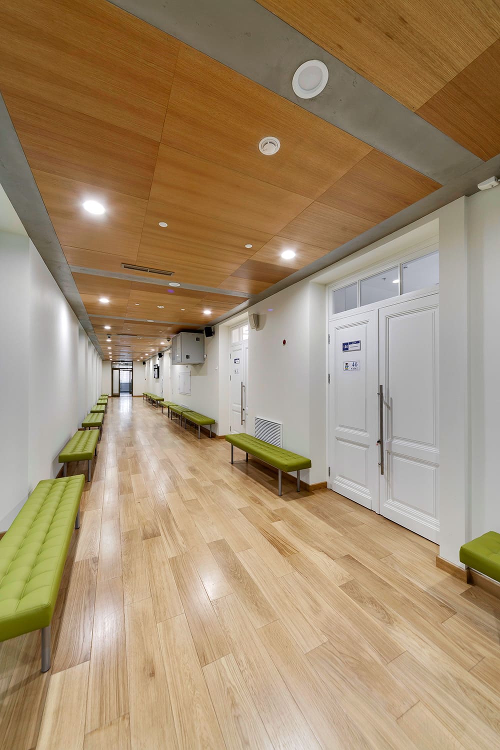 Шпонированные панели КМ-1 Wallhof Wood™ на потолках в коридорах и МОПах.