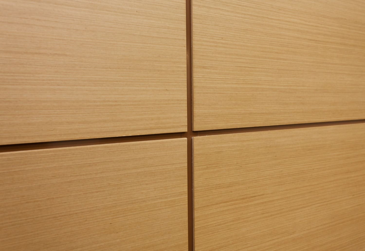 Отделка шпонированными стеновыми панелями всегда беспроигрышное решение в интерьерах коммерческого назначения. Стеновые панели легко монтируются, не требуют дополнительного ухода, надолго сохраняют свой внешний вид и качество фактуры. Стыковка панелей выполнена с зазором в 10 мм.