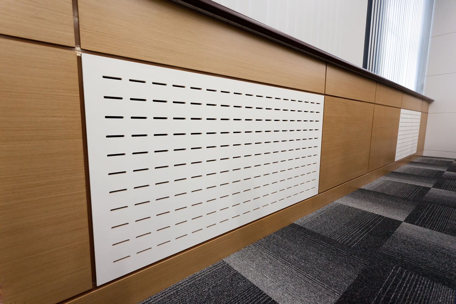 Панели с перфорацией декорируют элементы системы отопления, не препятствуя циркуляции теплого воздуха.
