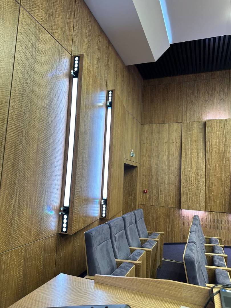 В интерьере использованы панели компании Wallhof нестандартной формы, которые были разработаны непосредственно для этого объекта с учетом всех особенностей помещения.