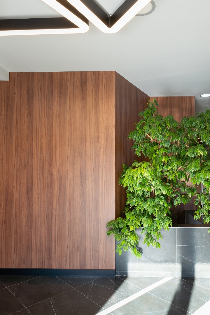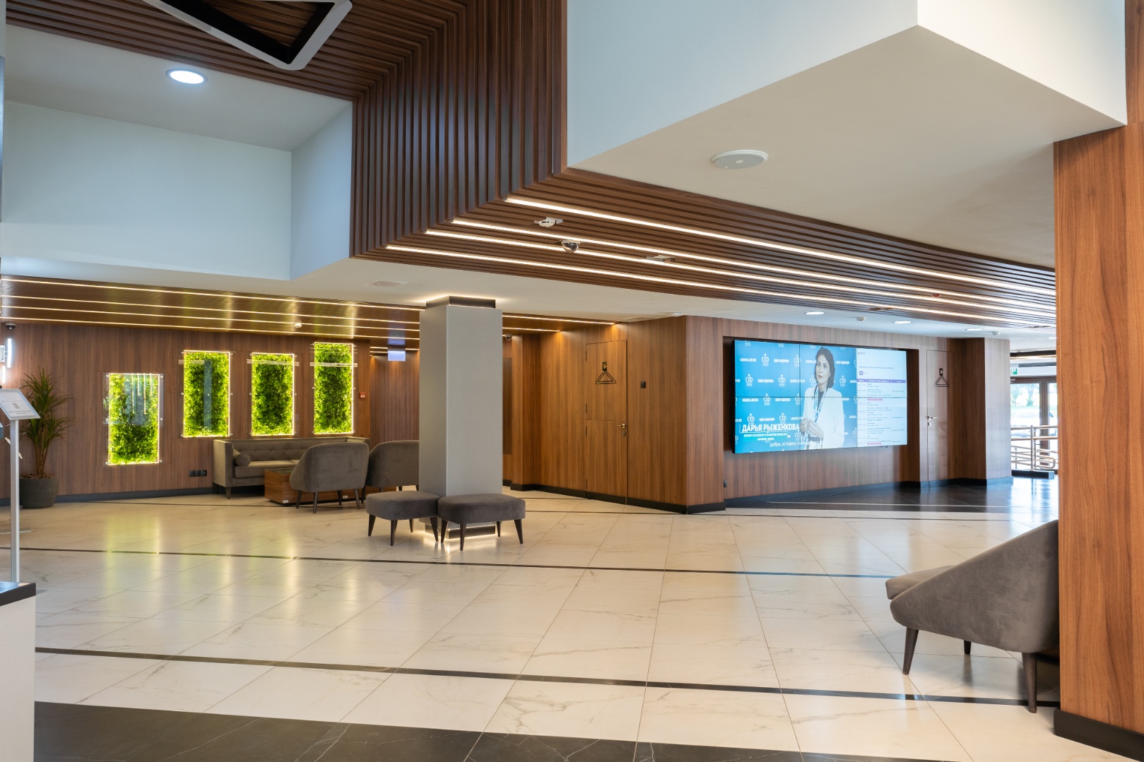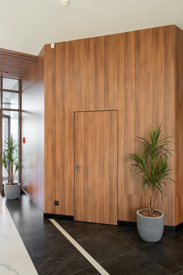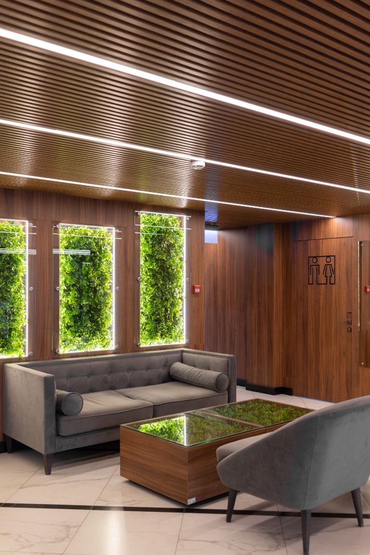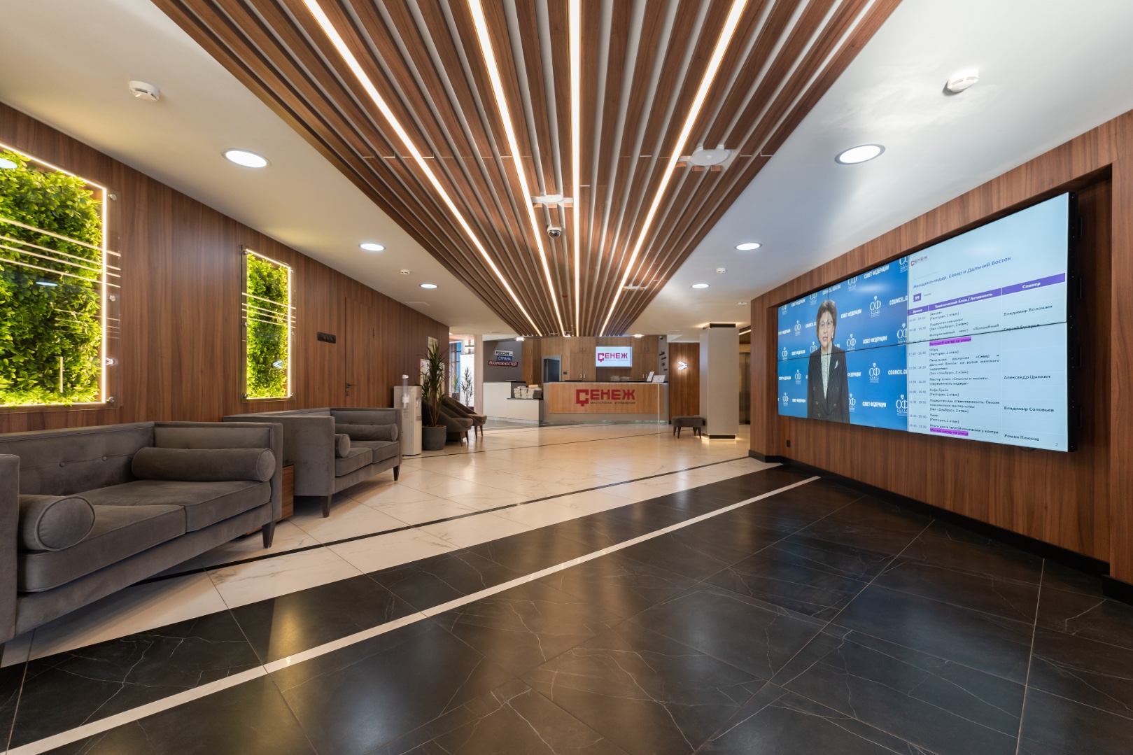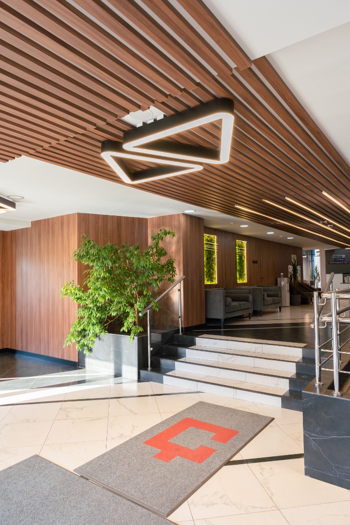 Внутренняя отделка новейшего центра дополнительного образования "Сенеж", выполненная с использованием премиальных шпонированных панелей фабрики Wallhof, подчеркивает статус центра, ориентированного на подготовку управленцев.