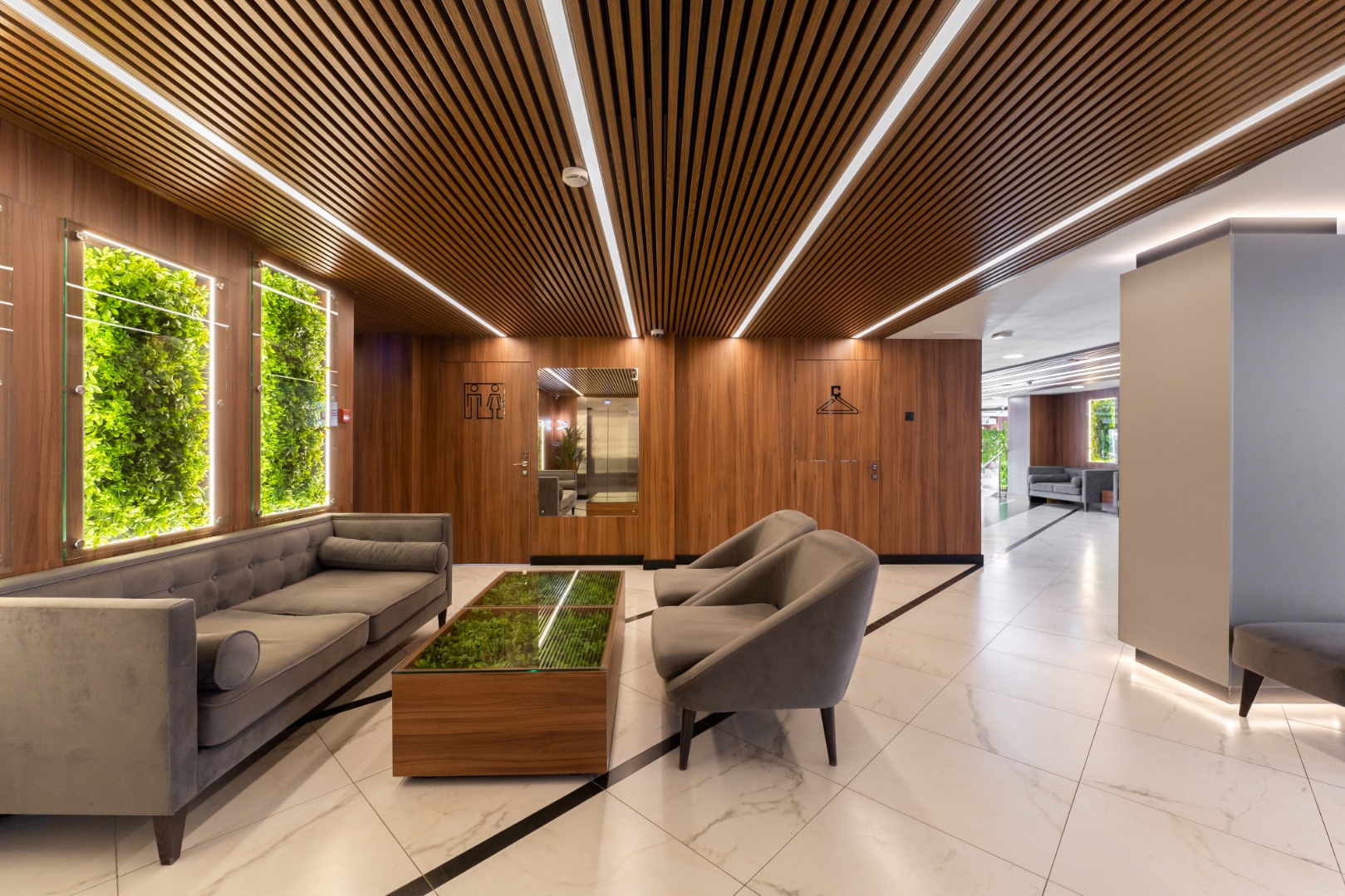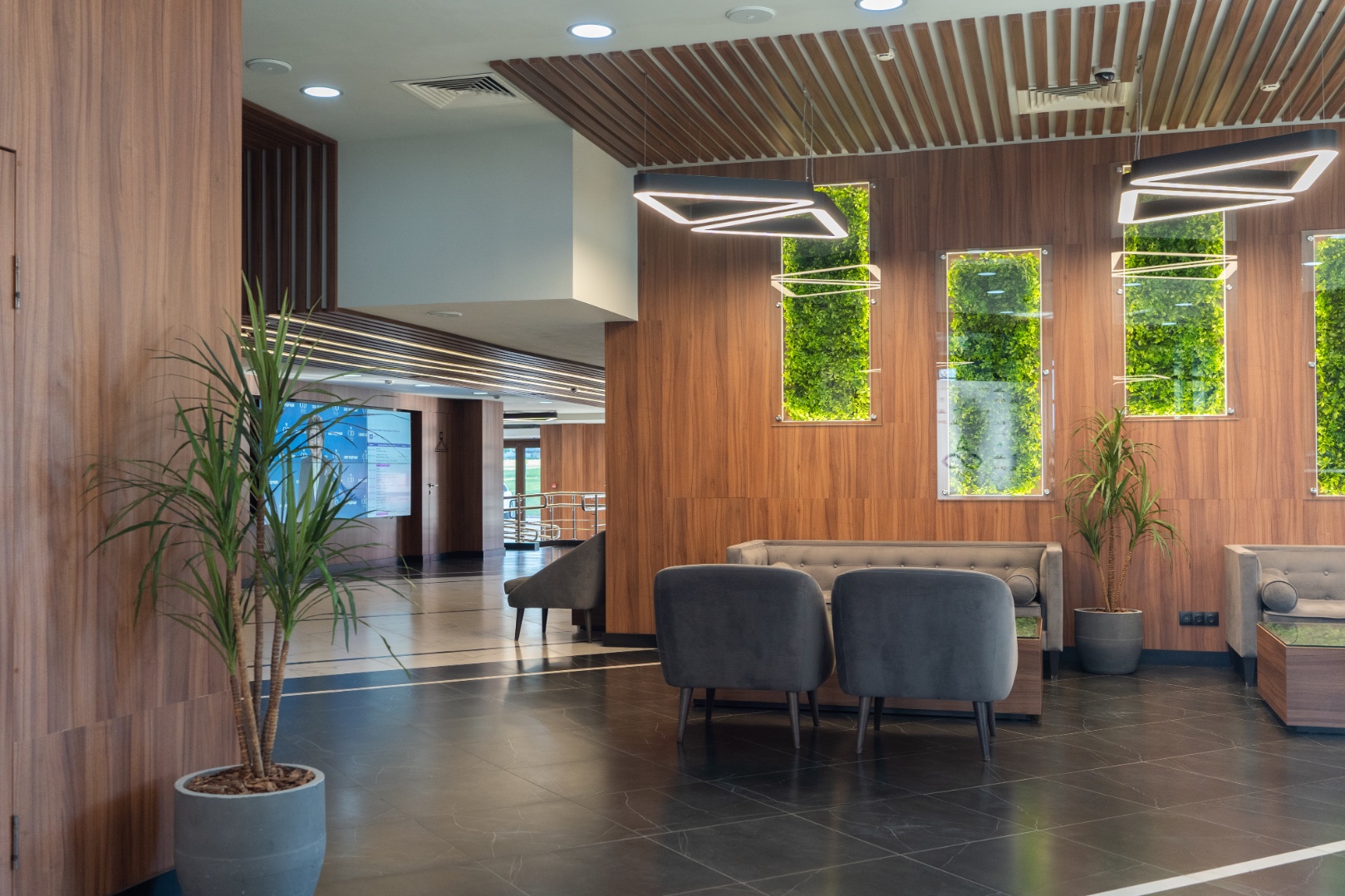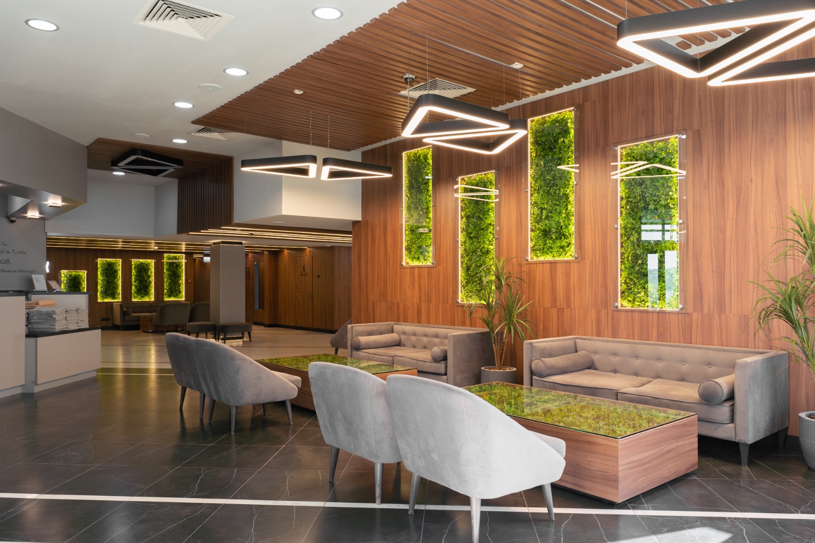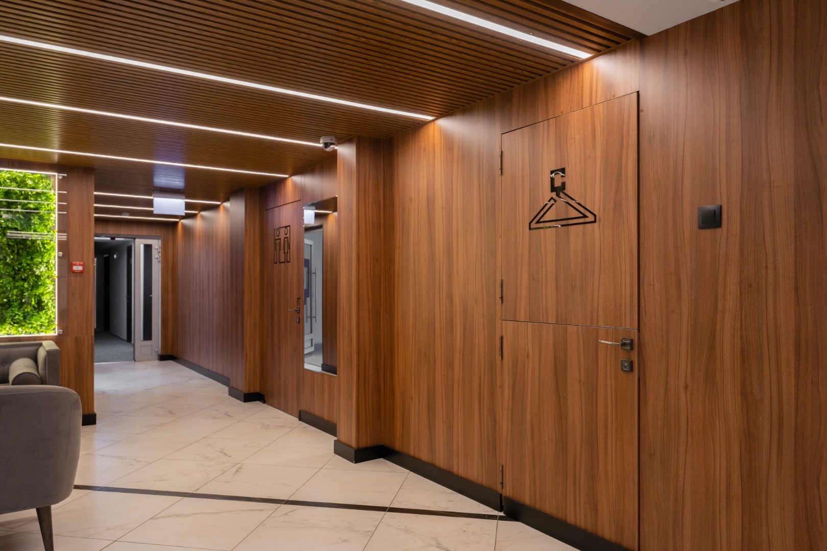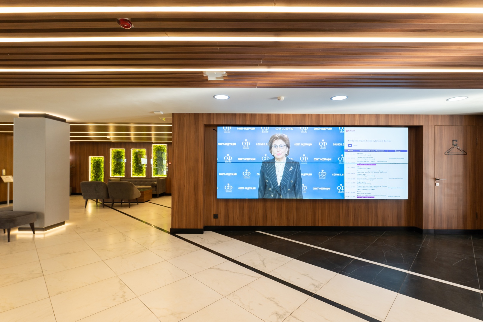 Внутренняя отделка новейшего центра дополнительного образования "Сенеж", выполненная с использованием премиальных шпонированных панелей фабрики Wallhof, подчеркивает статус центра, ориентированного на подготовку управленцев.