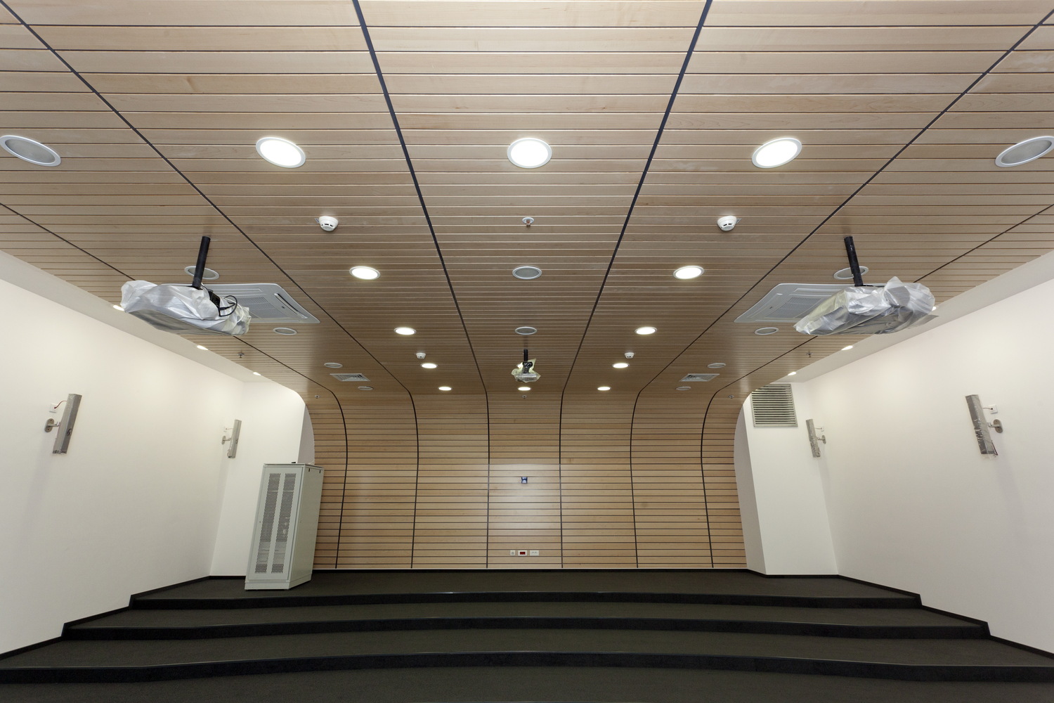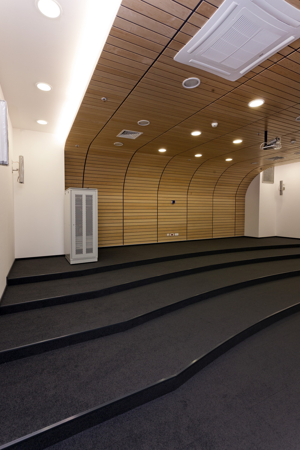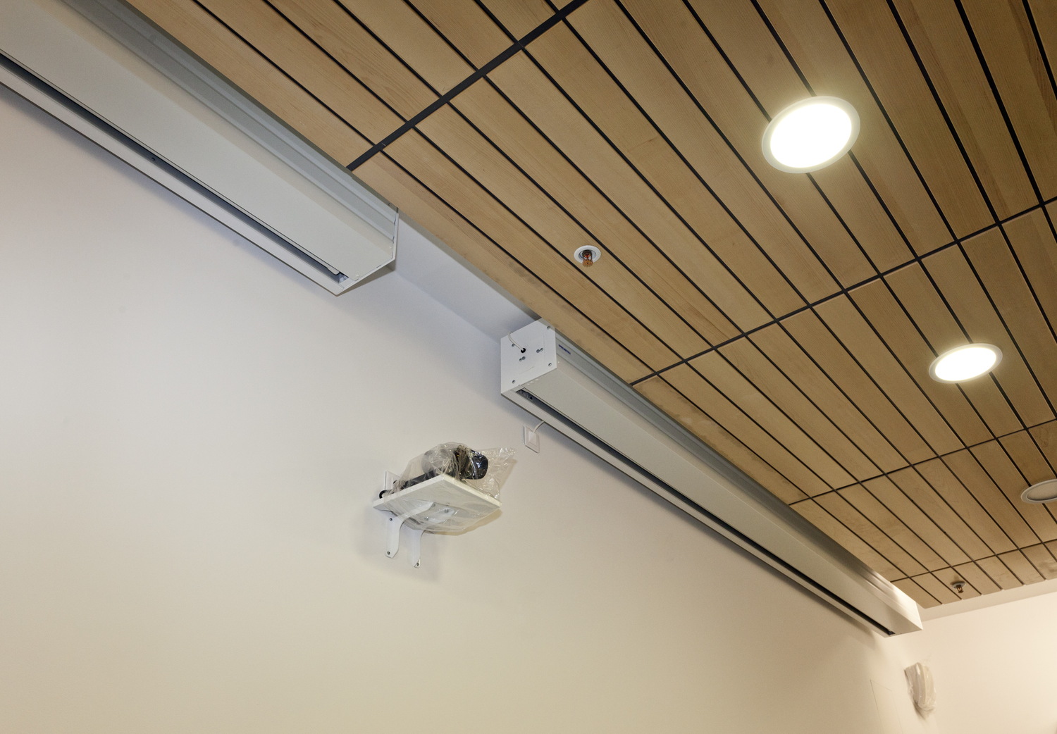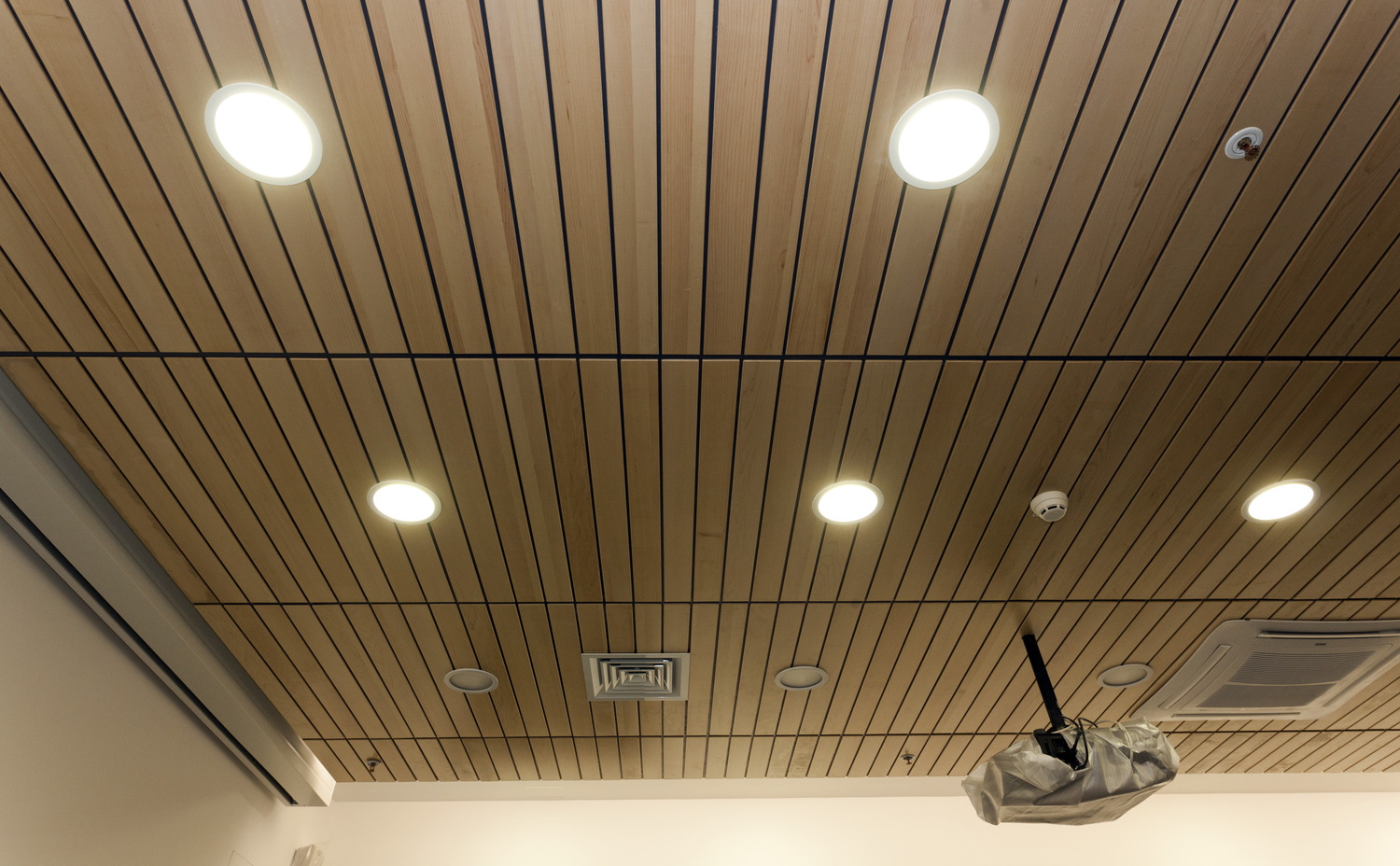 В проекте использовано изящное решение – визуальное объединение пространства потолка и одной из стен. Дерево, перетекающее в ритмичном рисунке со стены на потолок отсылает к современной и популярной скандинавской традиции, создает ощущение комфорта, защищенности, одновременно деловой и дружеской атмосферы в учебных классах.