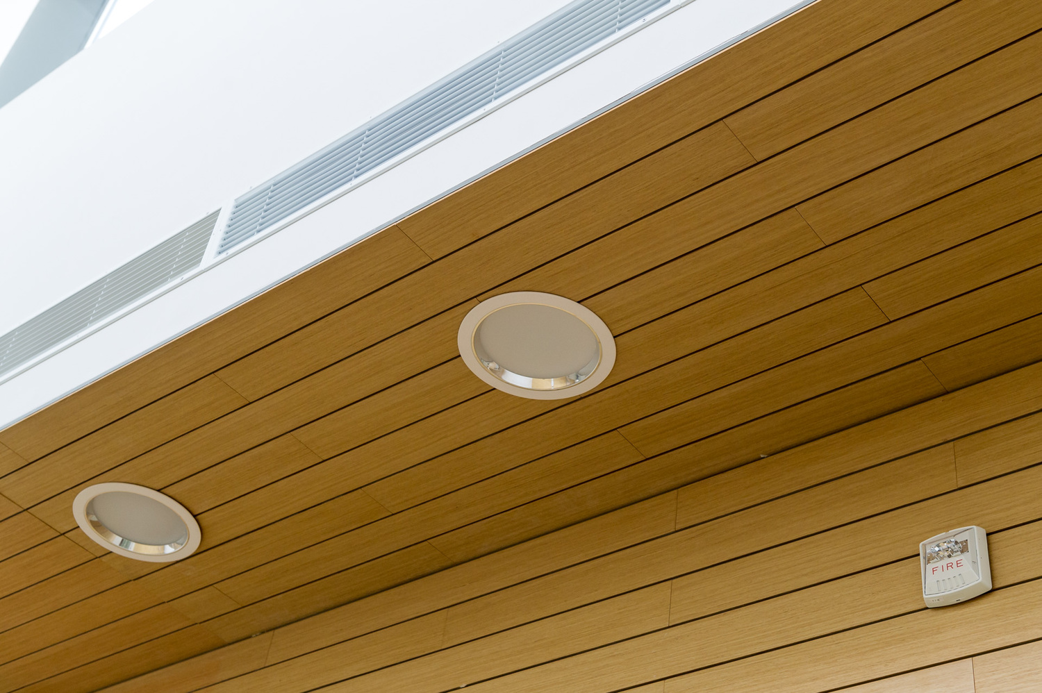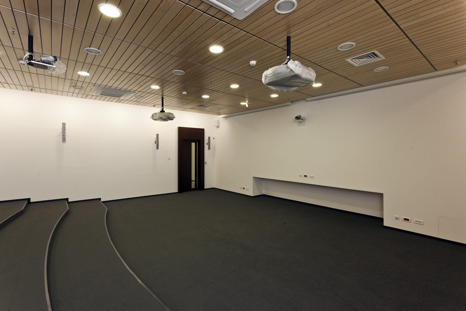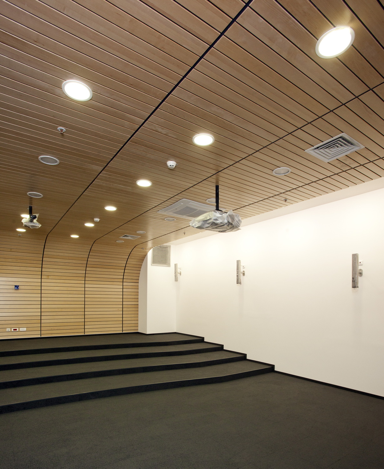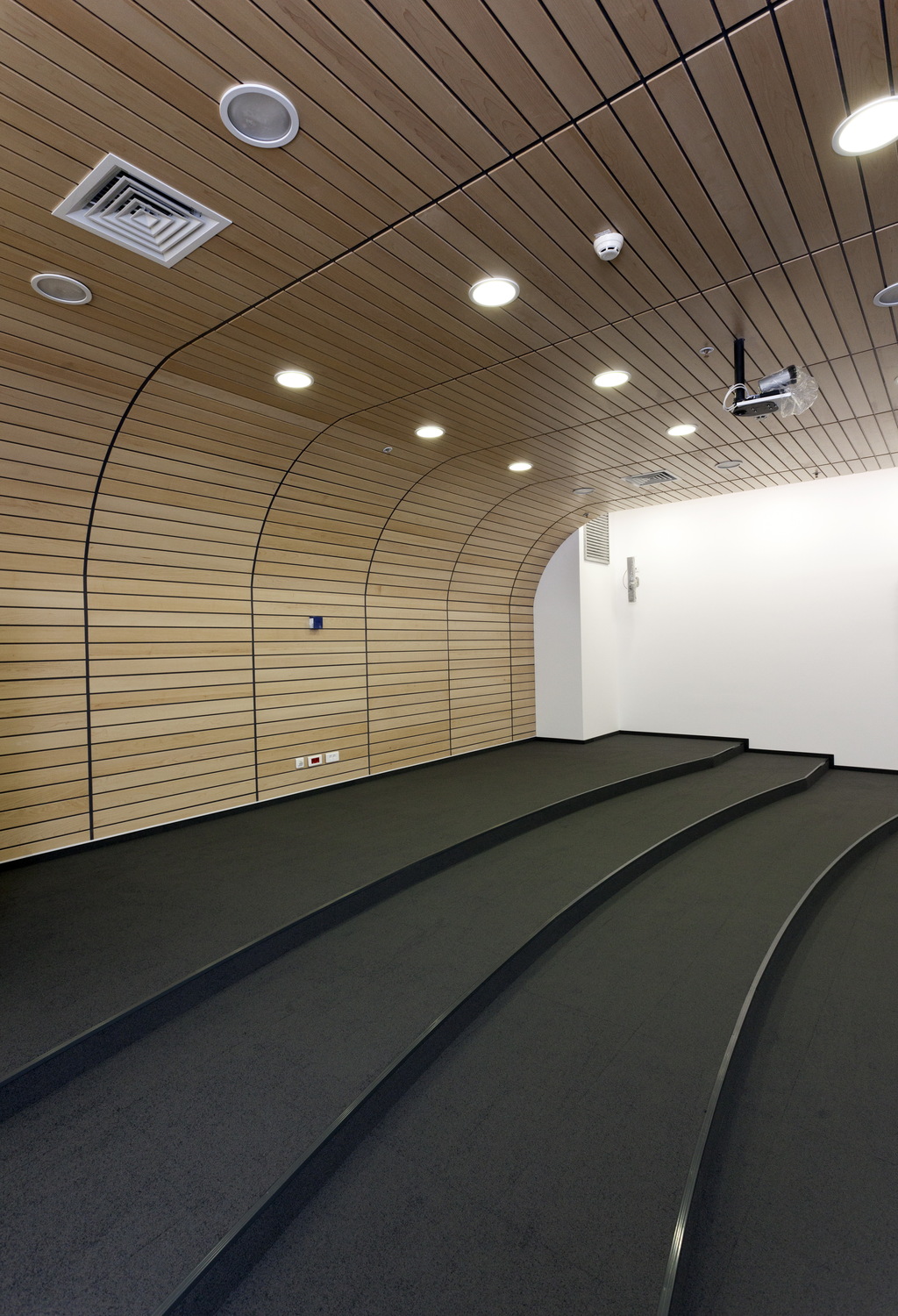 В проекте использовано изящное решение – визуальное объединение пространства потолка и одной из стен. Дерево, перетекающее в ритмичном рисунке со стены на потолок отсылает к современной и популярной скандинавской традиции, создает ощущение комфорта, защищенности, одновременно деловой и дружеской атмосферы в учебных классах.