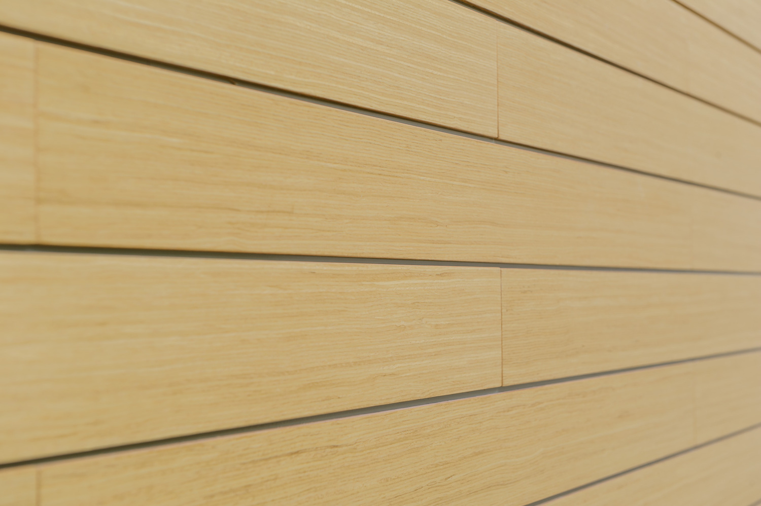 Панели Wallhof Premium Wood™ – это панели, облицованные натуральным древесным шпоном Premium Wood™ высшего качества. В проекте был выбран параллельный вариант укладки панелей с расстоянием между ними в 10 мм. Размер панелей 1250х100 мм.