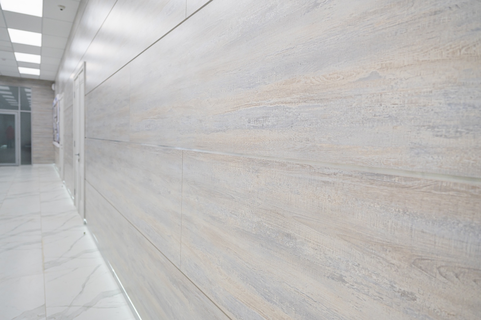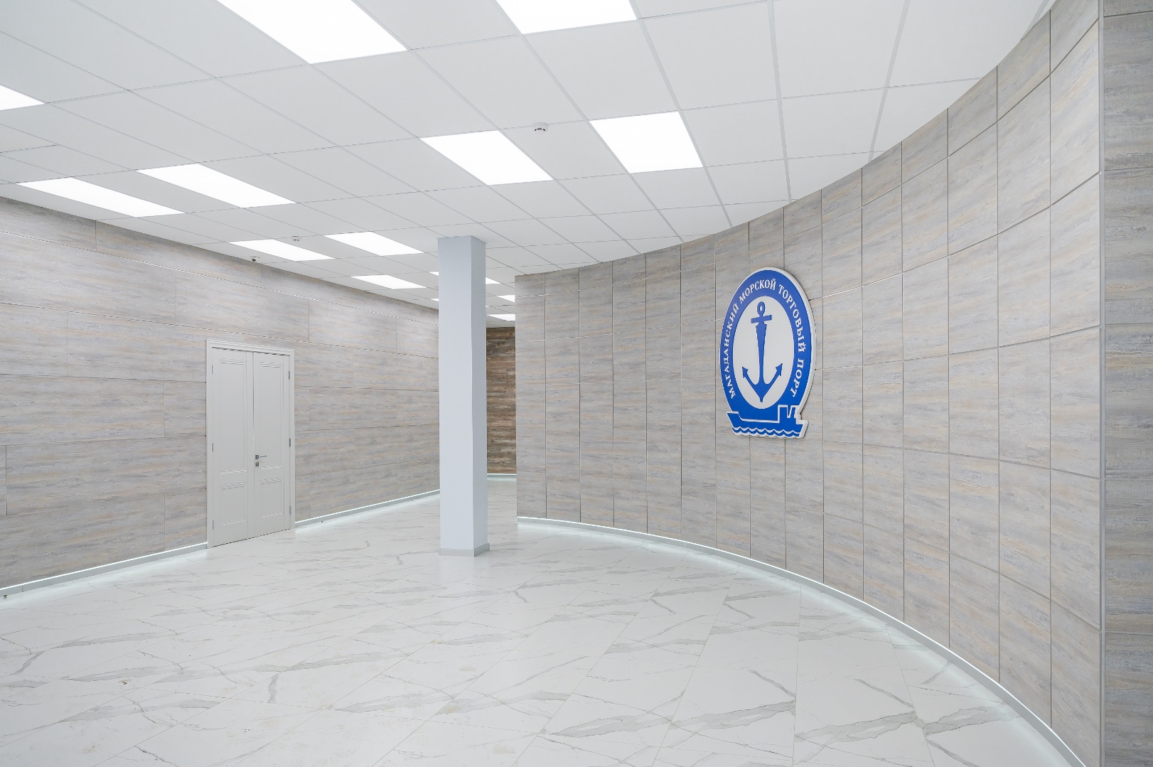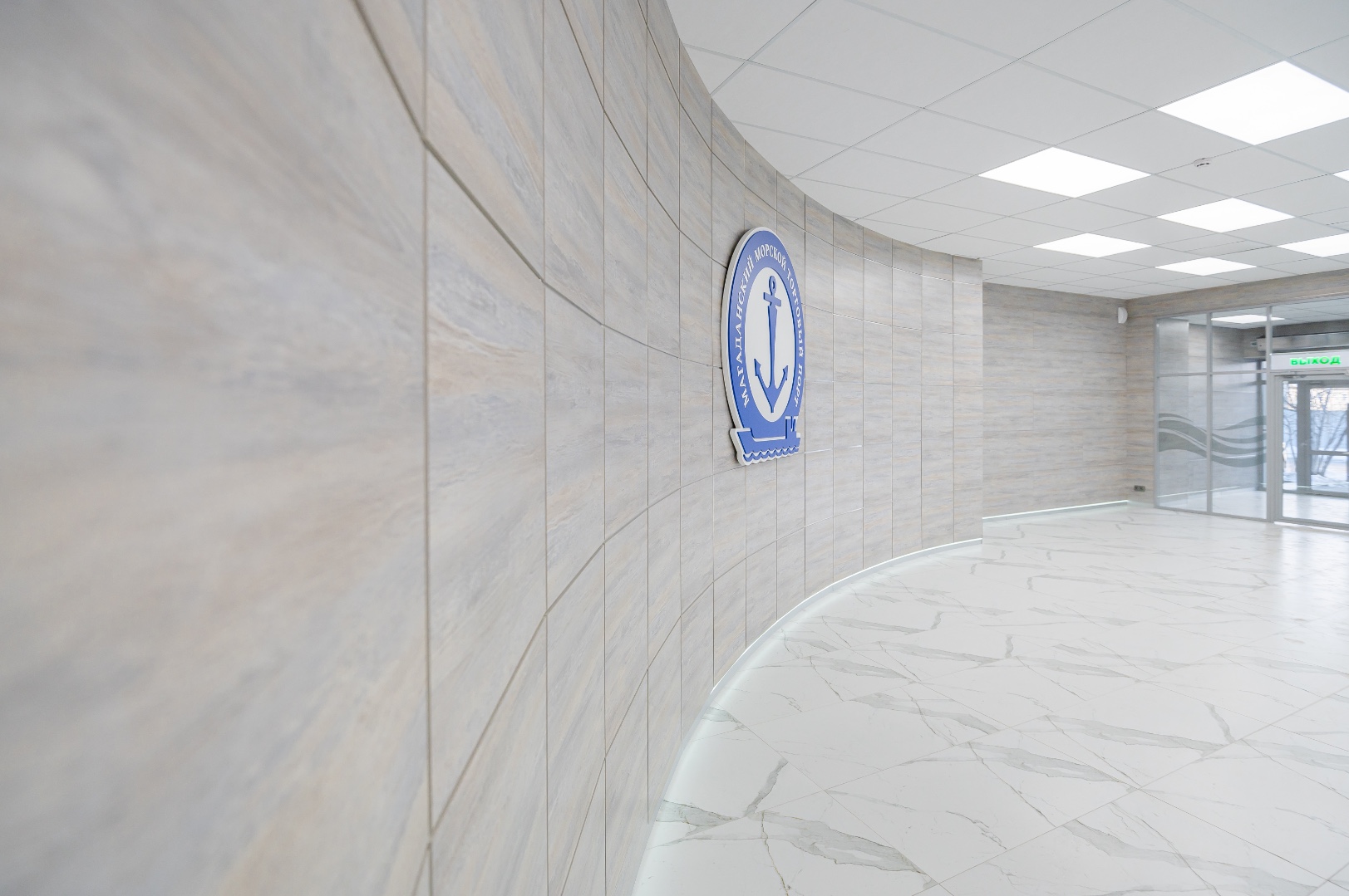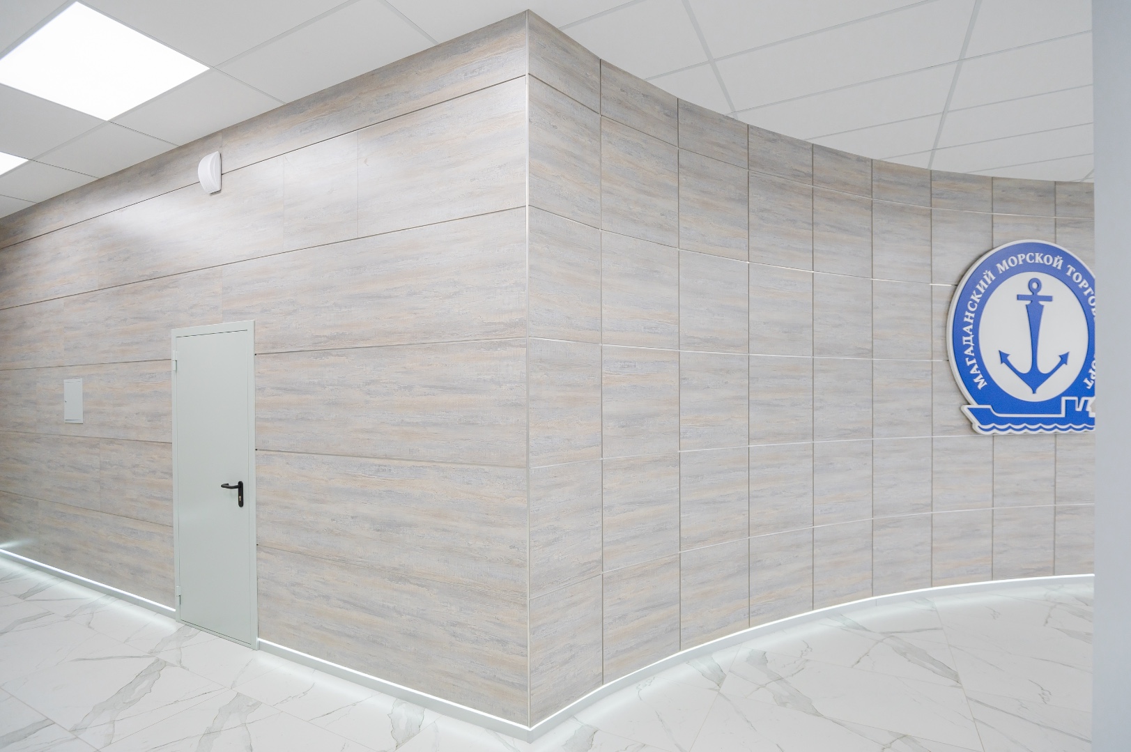 Обновленная входная группа магаданского морского торгового порта полностью выполнена в холодных светлых тонах и выглядит очень целостно благодаря сочетанию светлого керамогранита с рисунком калакатта и панелей Wallhof HPL в декоре Полярный дуб. Естественность декора подчеркивается не только высочайшей детализацией изображения, нанесенного на HPL, но и фактурным тиснением, имитирующем структуру натурального дерева. Также важной особенностью проекта является радиусная стена, осуществить отделку которой удалось благодаря прямым наборным элементам малой длины – такое решение возможно благодаря индивидуальному подходу фабрики Wallhof к реализации каждого объекта, а также наличию сразу ряда технических решений для реализации каждой потребности заказчика. Например, для отделки закругленных элементов производство Wallhof может изготавливать как небольшие прямые изделия, из которых набирается радиус, так и непосредственно целые радиусные панели, точно повторяющие характеристики стены.