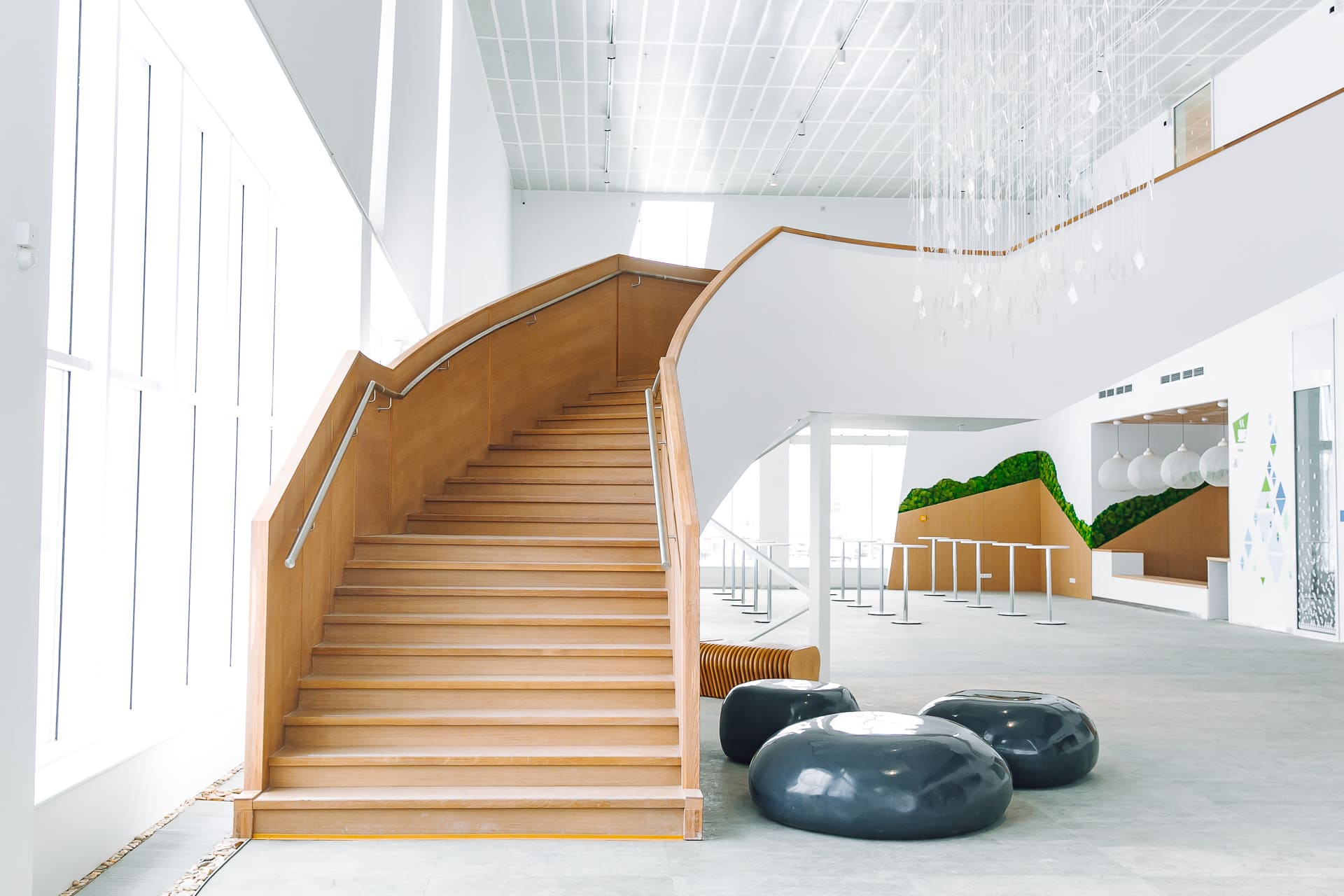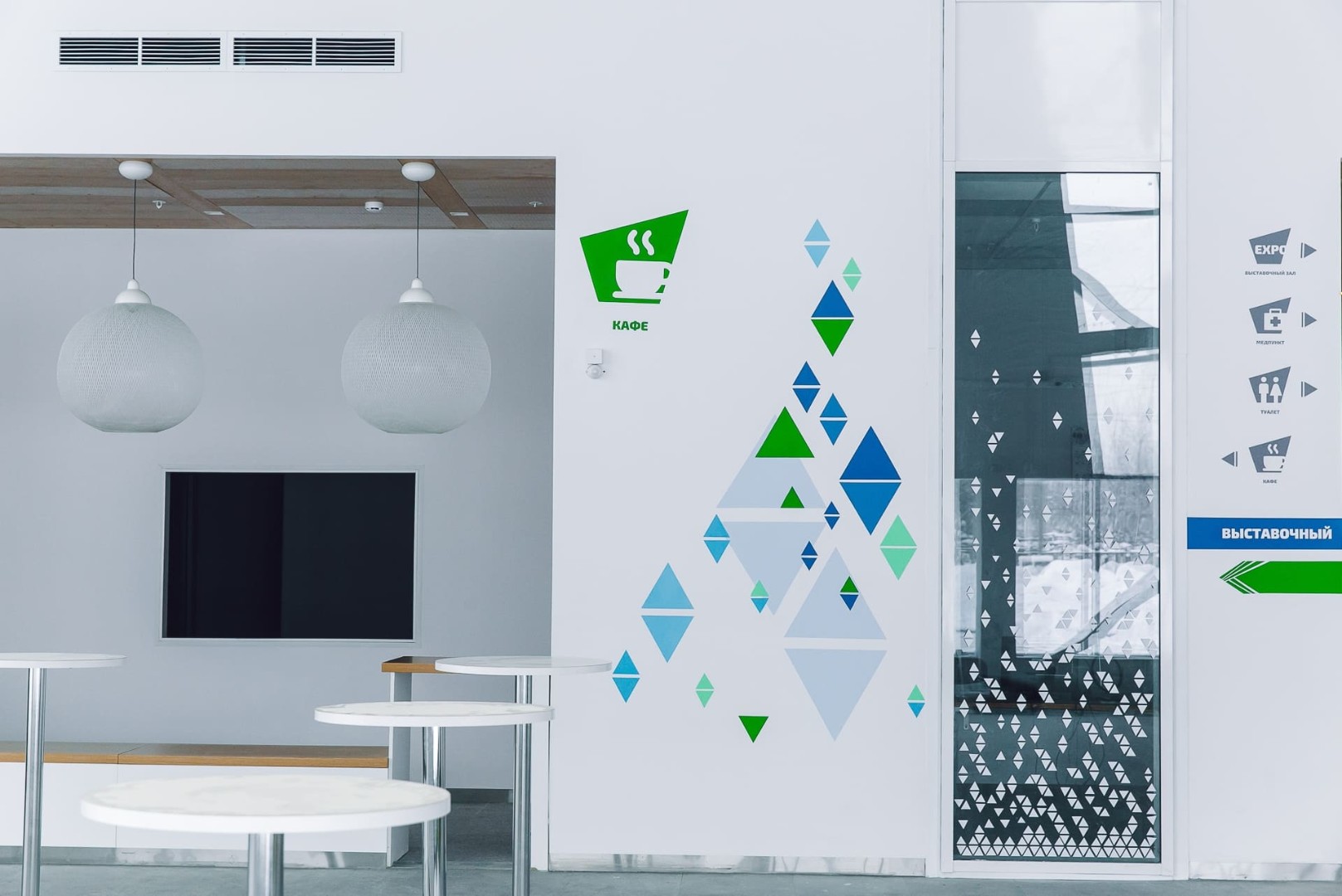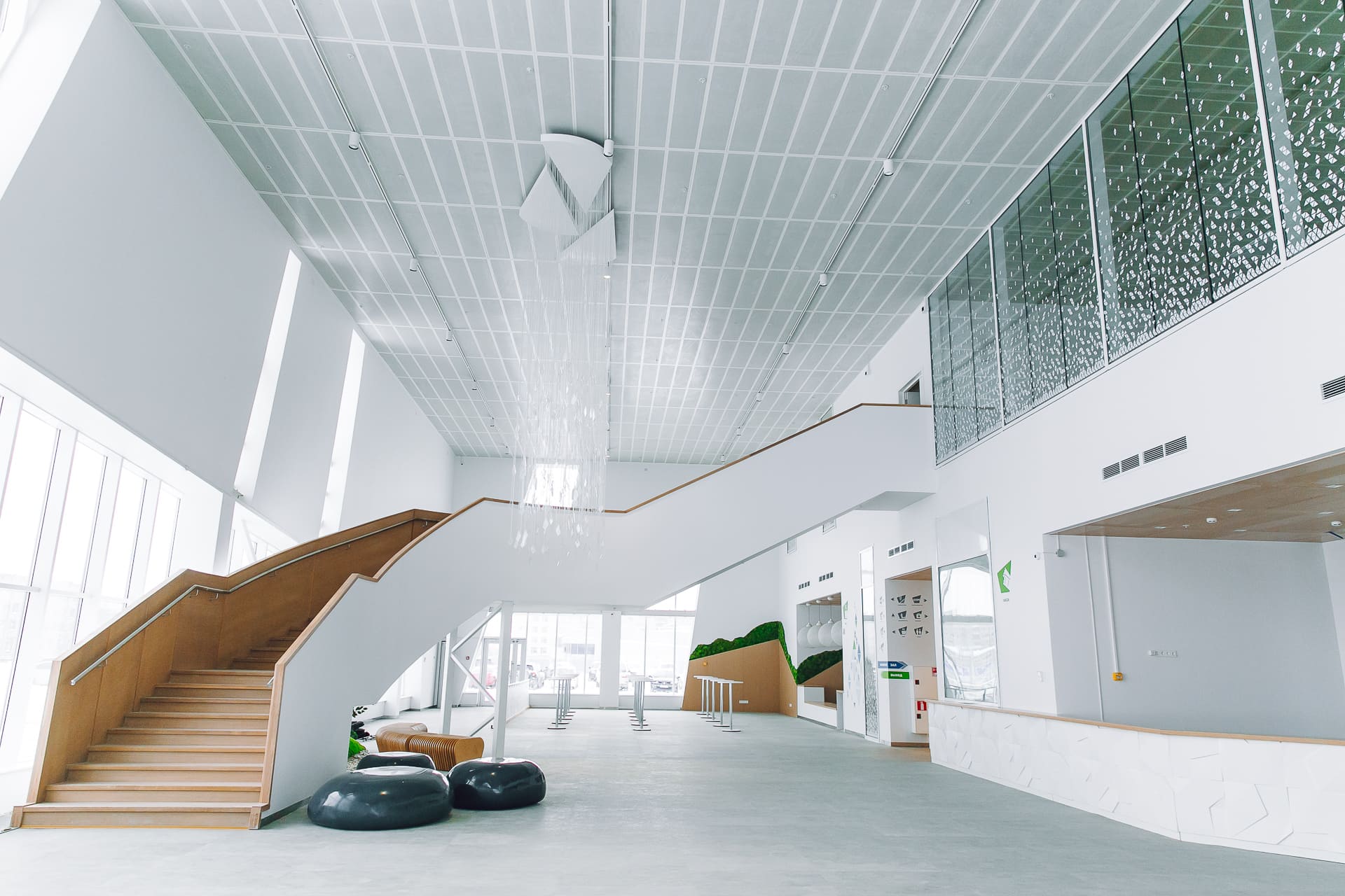 Выставочные пространства нуждаются в хорошо продуманной архитектуре и дизайне. Стенды и экспозиции должны вписываться в общий интерьер выставочного комплекса. Отличный пример такого дизайна представлен в «Норд Экспо» (г. Архангельск). Белые стены идеально сочетаются с лестничными маршами и вставками из шпонированных панелей.