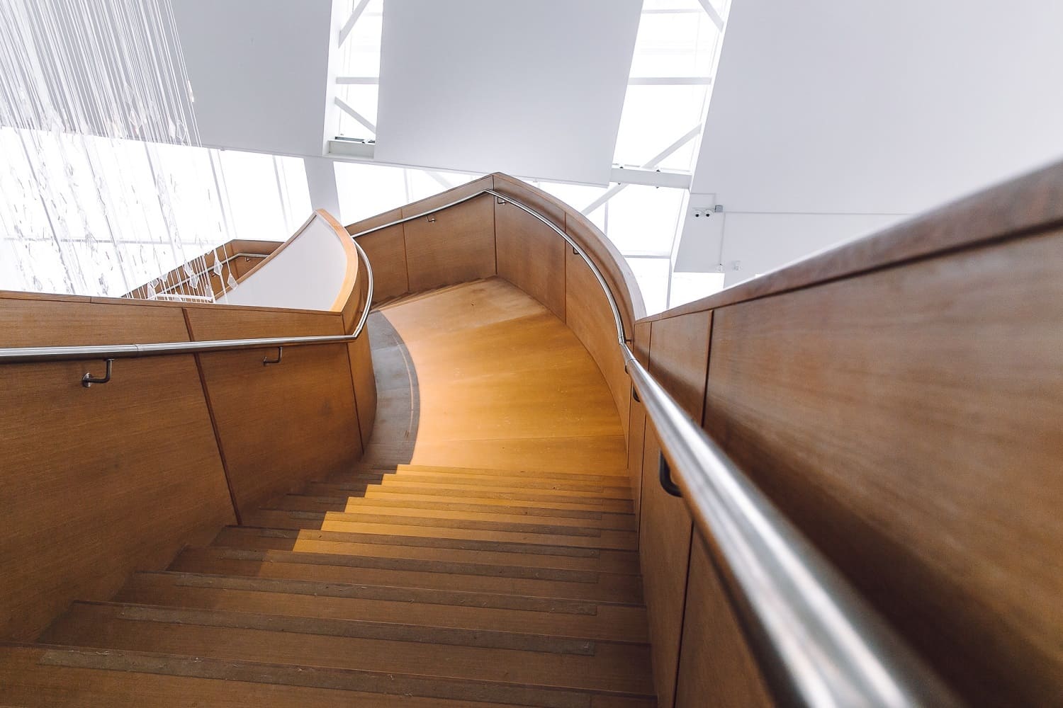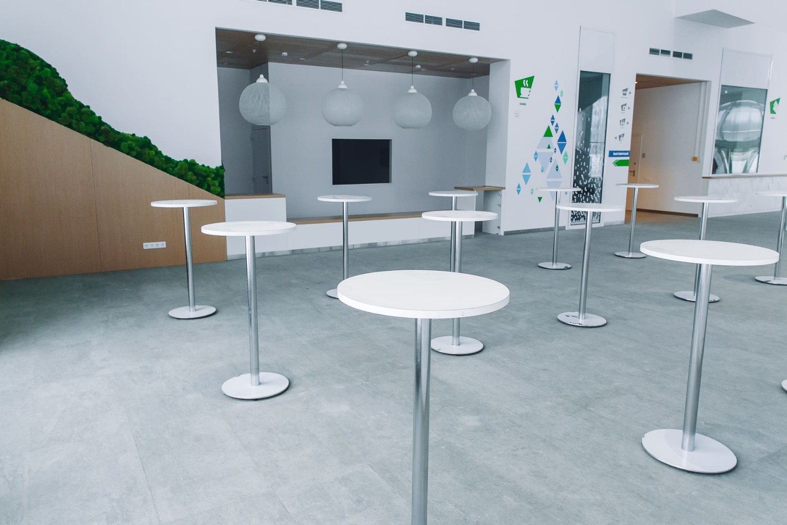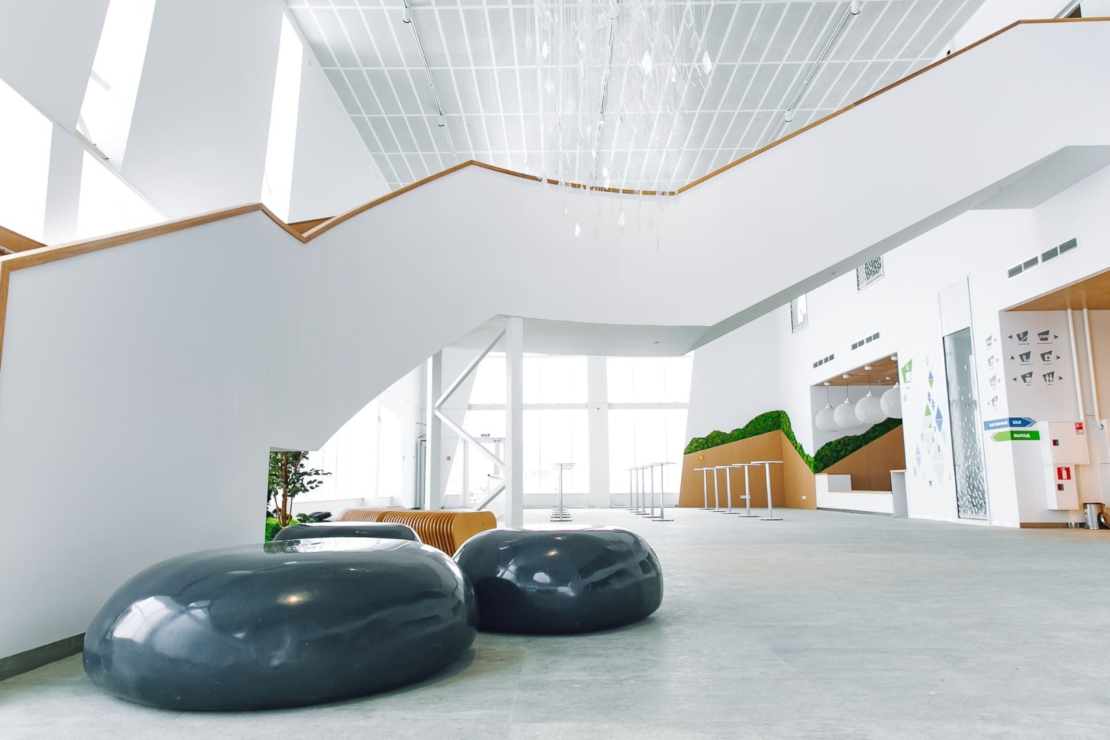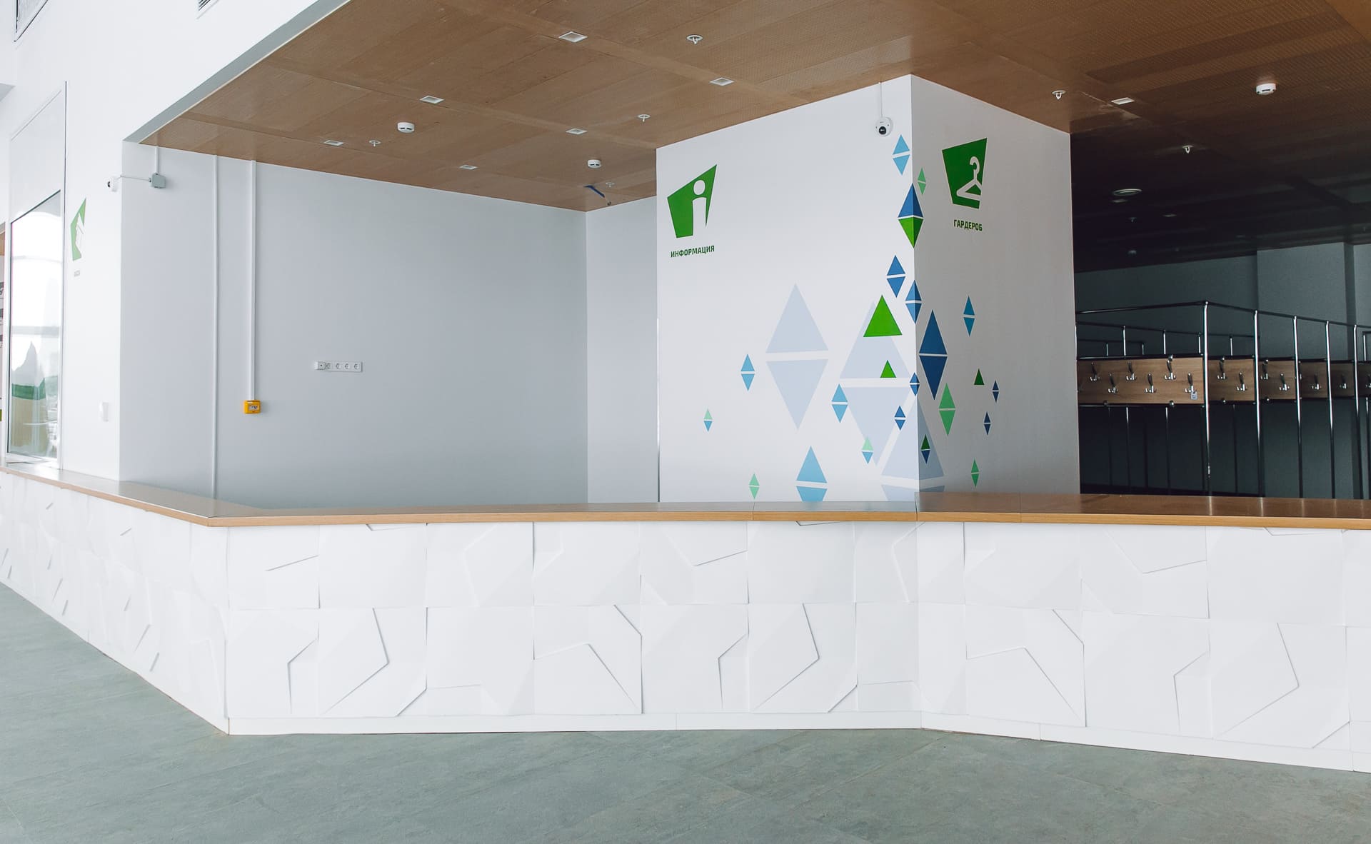 Выставочные пространства нуждаются в хорошо продуманной архитектуре и дизайне. Стенды и экспозиции должны вписываться в общий интерьер выставочного комплекса. Отличный пример такого дизайна представлен в «Норд Экспо» (г. Архангельск). Белые стены идеально сочетаются с лестничными маршами и вставками из шпонированных панелей.