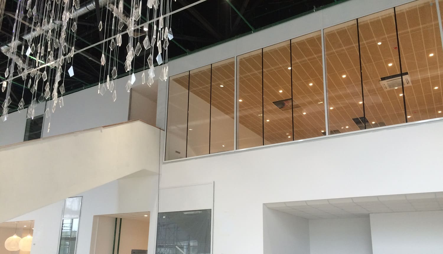 Во многих выставочных павильонах оборудованы конференц-залы для выступления спикеров. Важным нюансом при отделке таких помещений является качественное звучание голоса выступающего. Хорошей звуковой акустики в конференц-зале «Норд Экспо» удалось добиться при помощи потолочных акустических панелей Wallhof Acoustik ™.