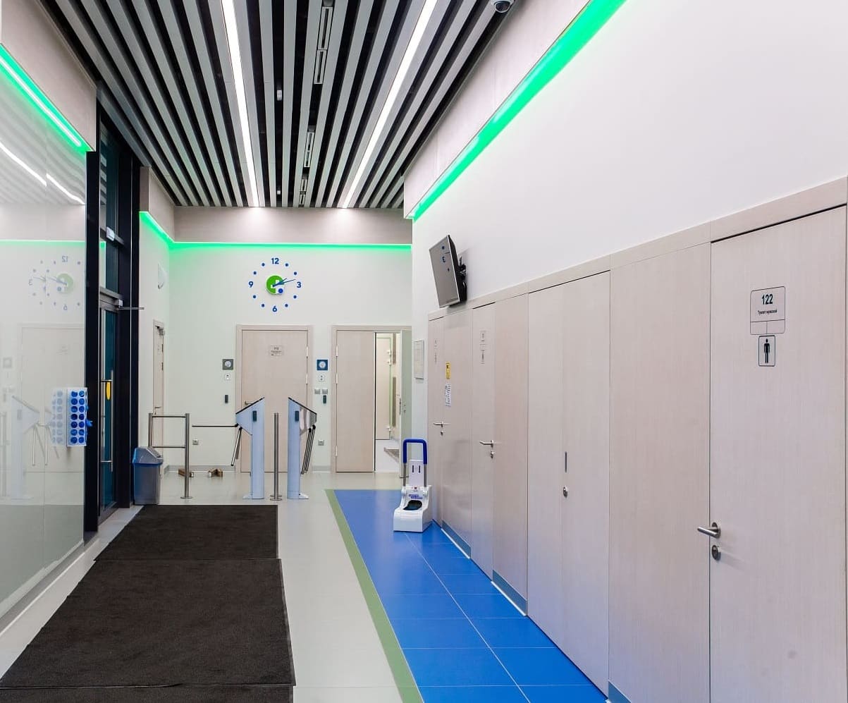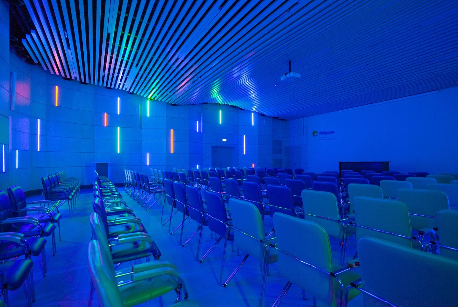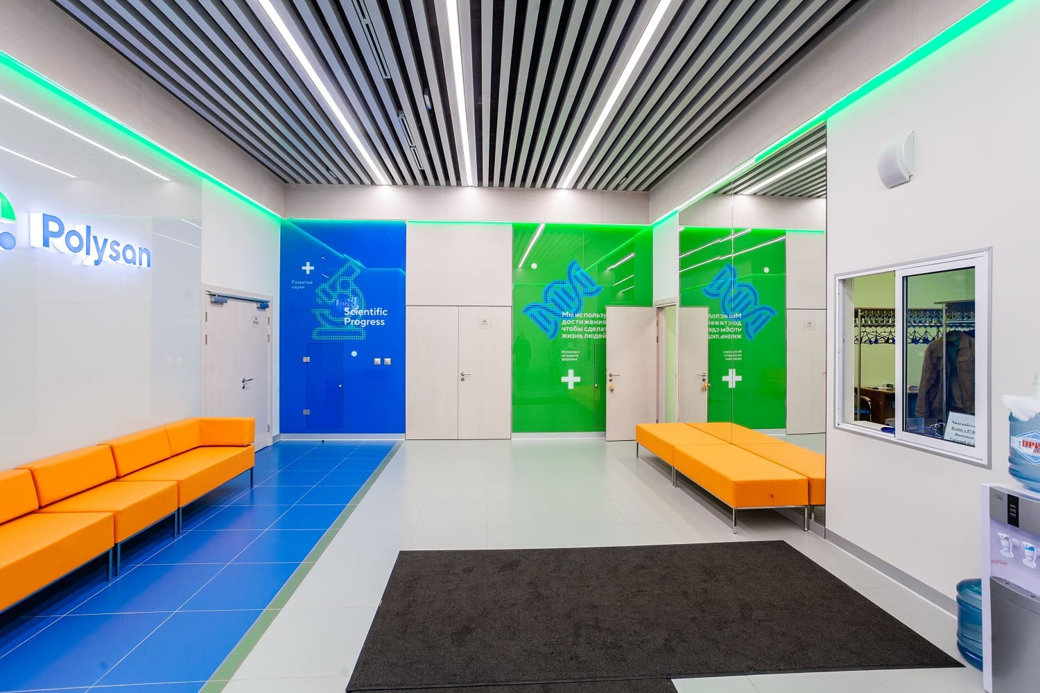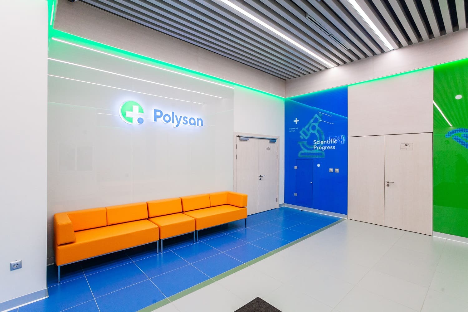 Кабинеты фармацевтического завода «Полисан» отделаны шпонированными стеновыми панелями. Радиаторы скрыты перфорированными панелями с радиальной перфорацией. В зале переговоров фармацевтического завода «Полисан» использовали шпонированные панели файн-лайн беленый дуб. Толщина панелей 12 мм, более 30 типоразмеров.