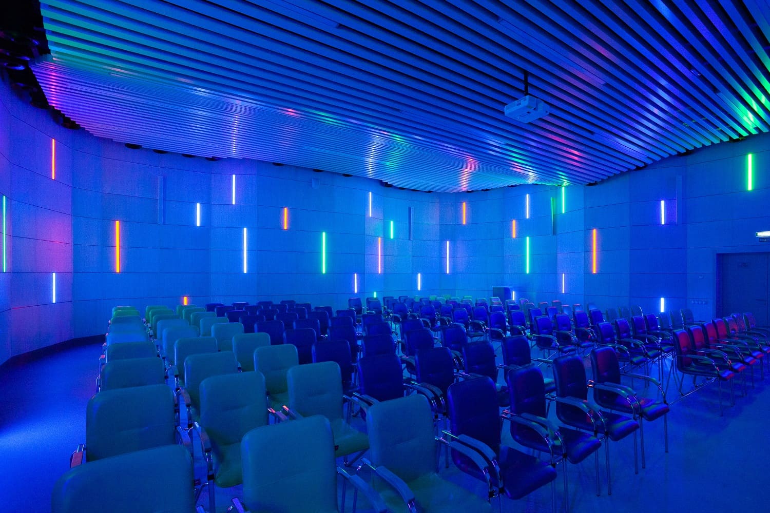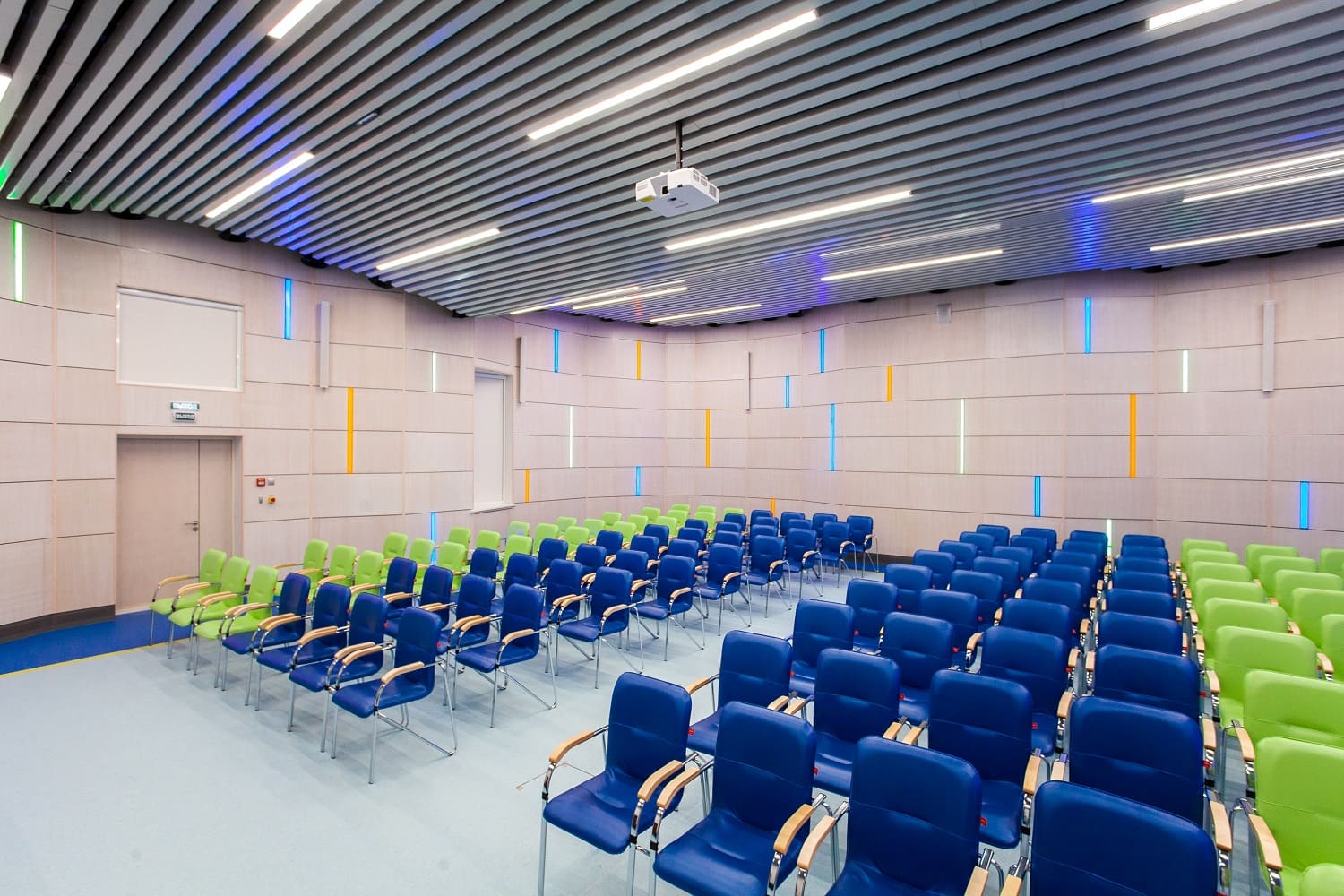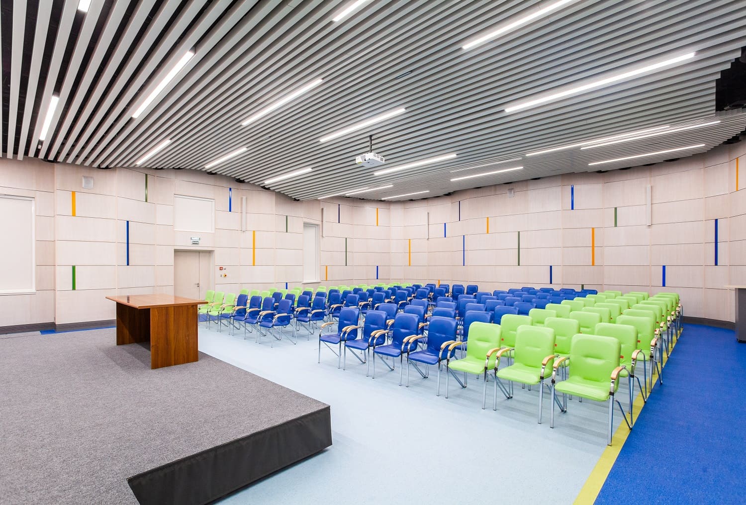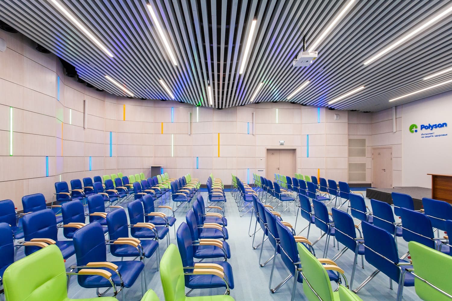 Актовый зал отделан стеновыми панелями Wallhof со шпоном "Белёный дуб".