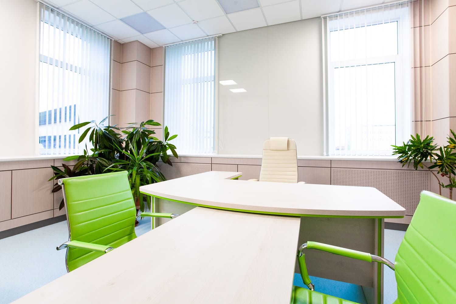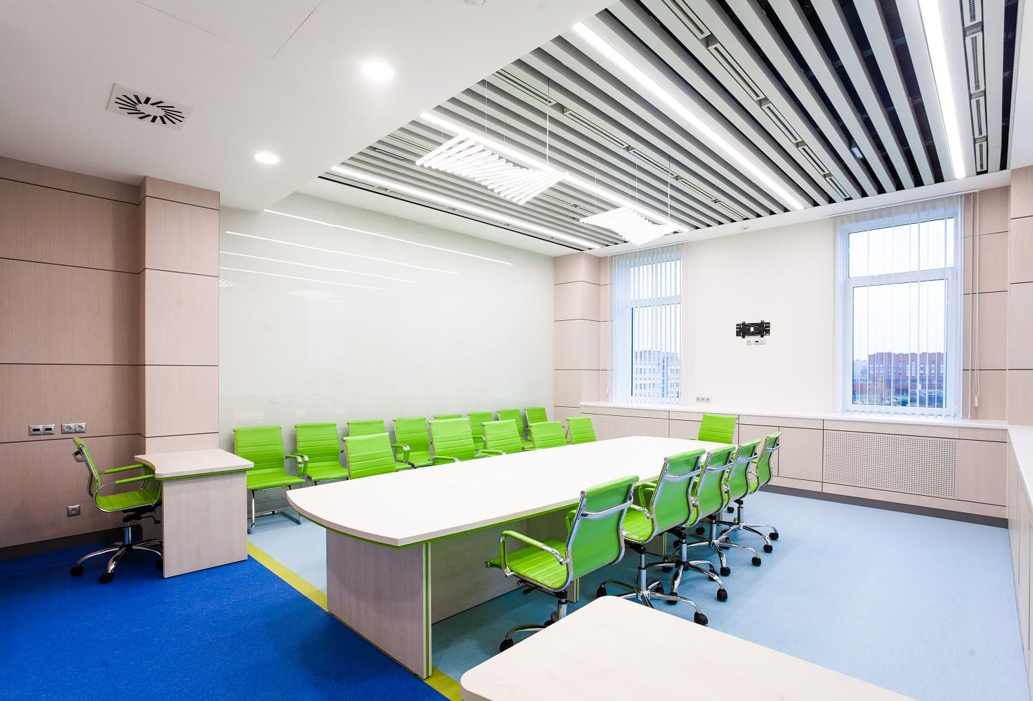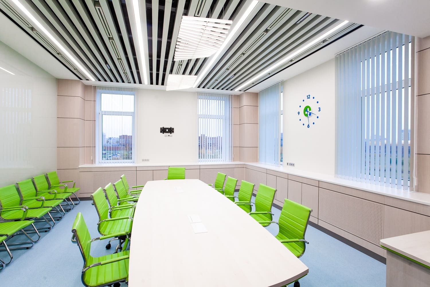 В зале переговоров фармацевтического завода "Полисан" использовали шпонированные панели оттенка белый дуб