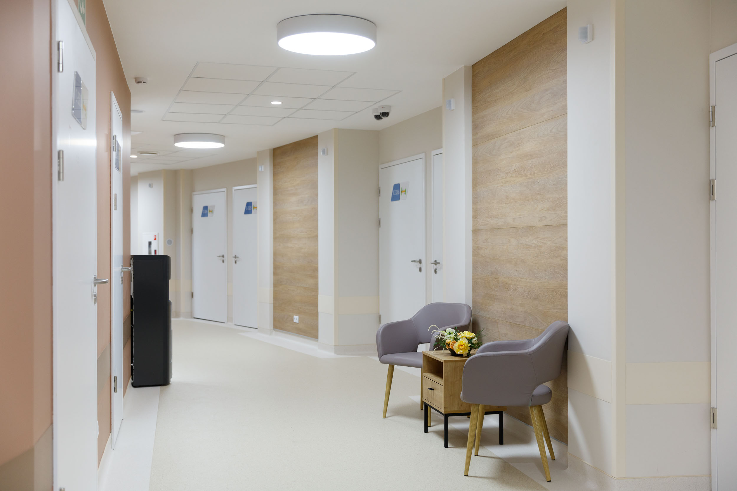 Для этого проекта заказчик выбрал стеновые панели с покрытием HPL. Обработка помещений медицинских учреждений очень серьёзный процесс. Стеновые панели Wallhof HPL отвечают всем нормам и стандартам обработки обеззараживающими составами.