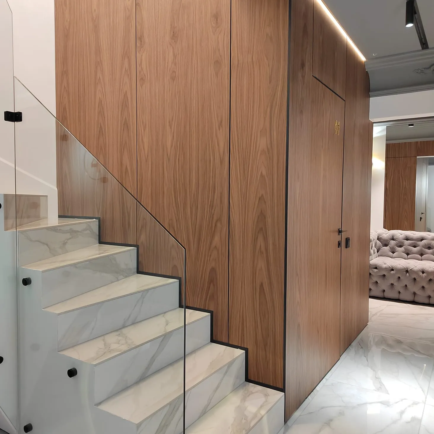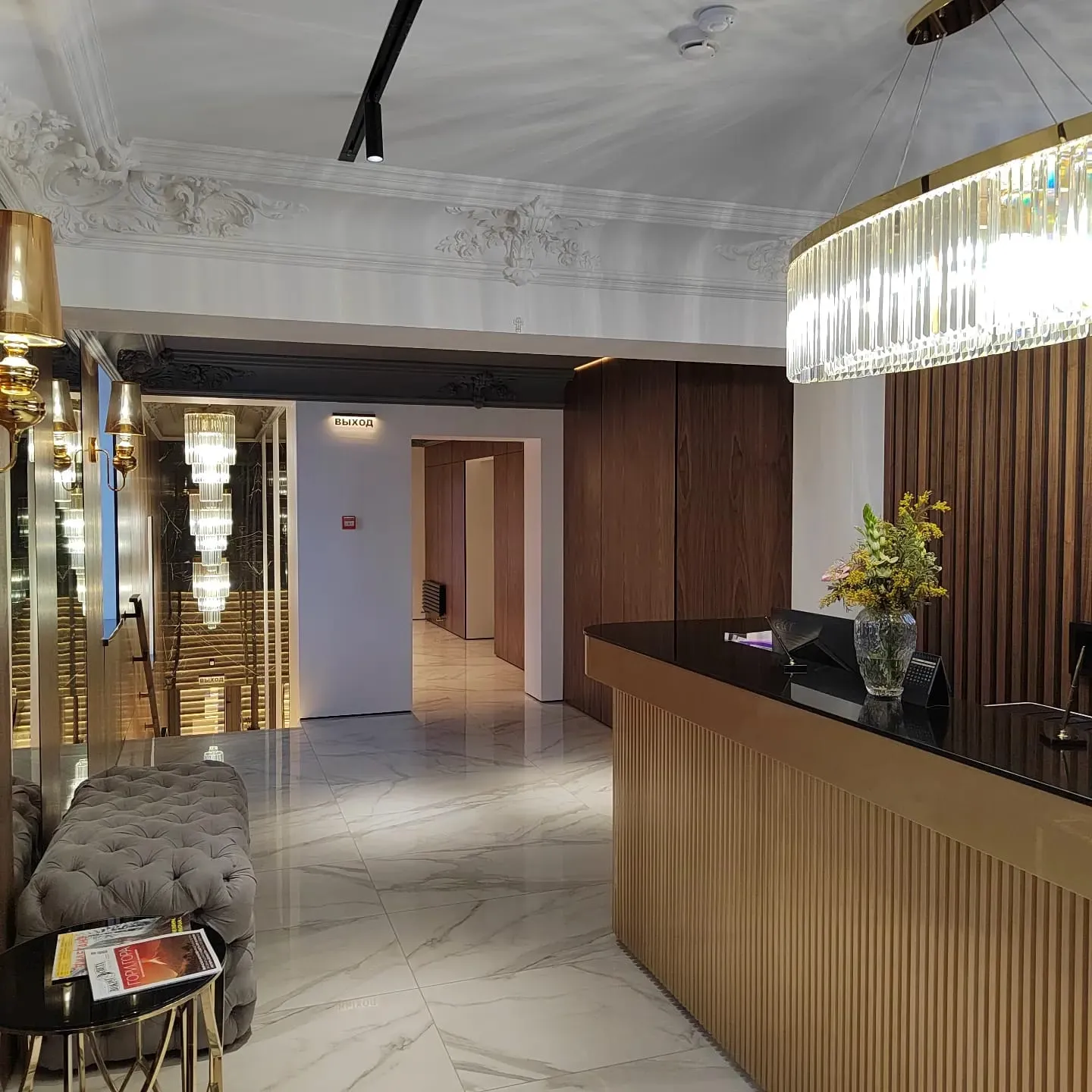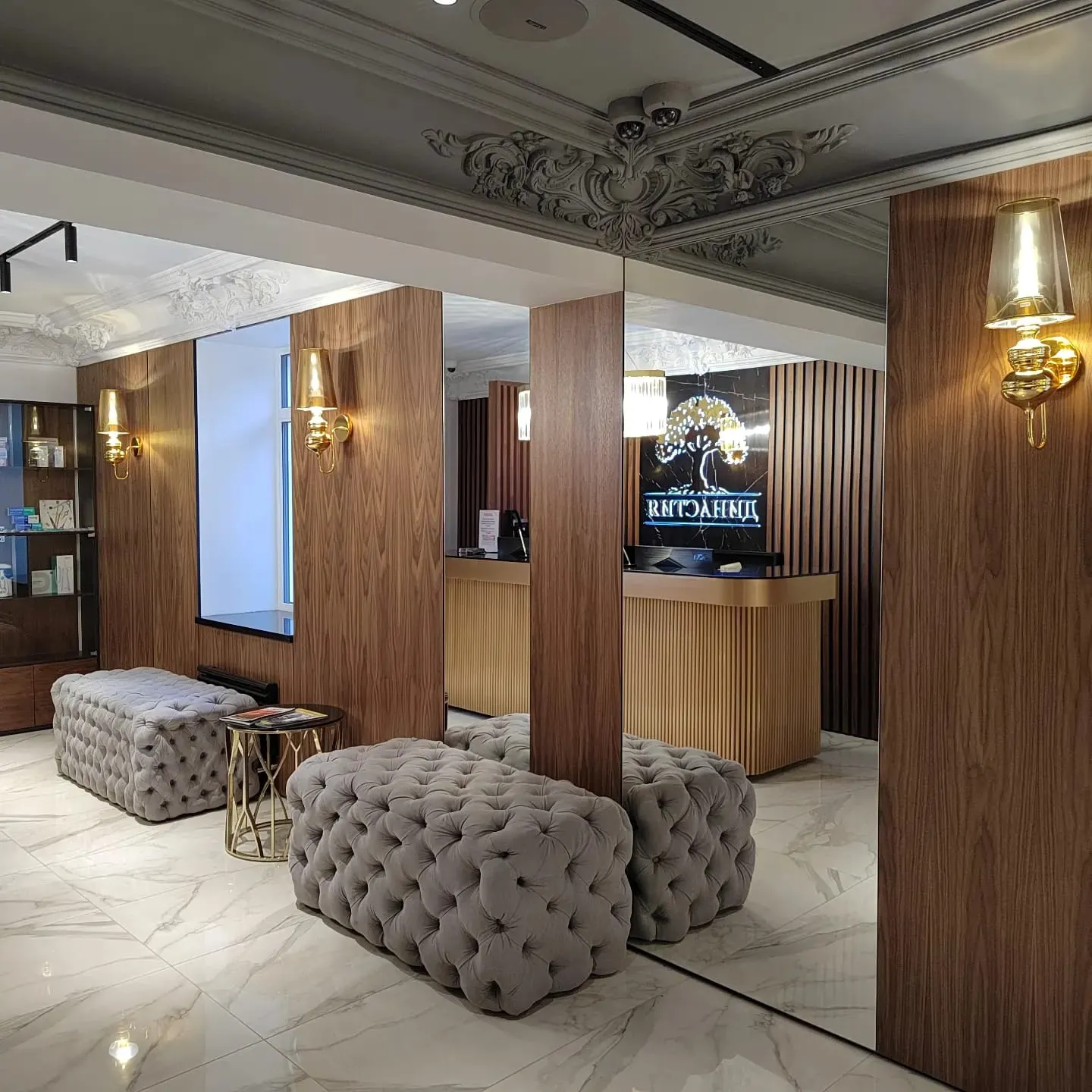 Даже небольшие объекты могут приносить массу эстетического удовольствия, если они сделаны с должным вниманием ко всем деталям. Именно такой получилась клиника Династия Премиум в Вологде, где дизайнер нашел прекрасное сочетание в виде керамики с декором Калакатта и панелей Wallhof Wood с отделкой из натурального шпона американского ореха. Сочетание дерева и камня – классика, существующая вне времени.