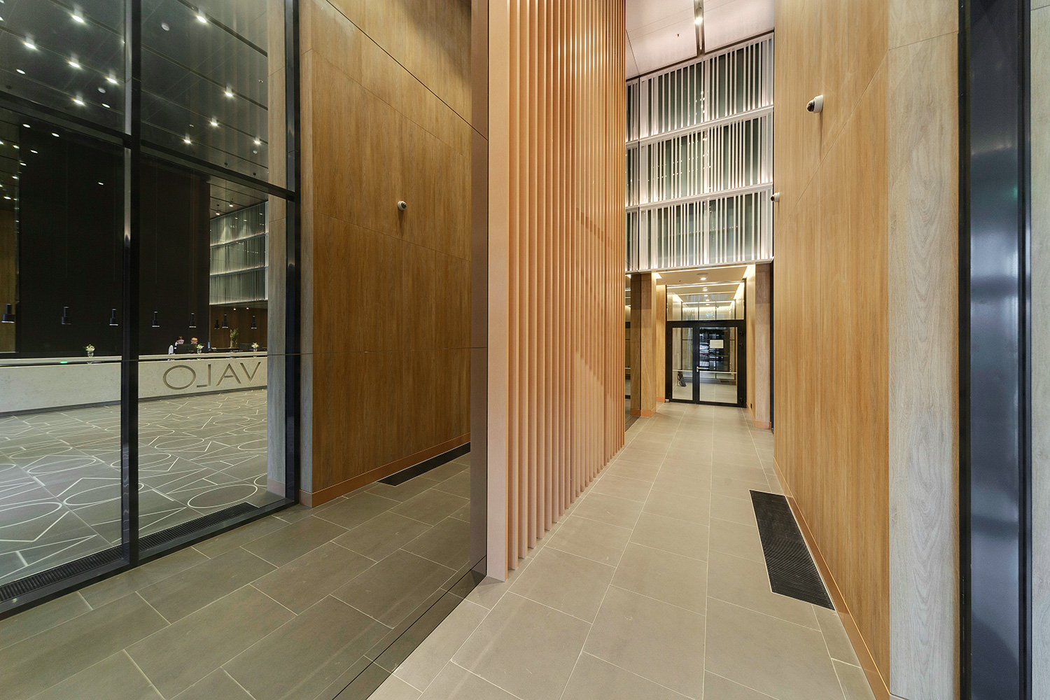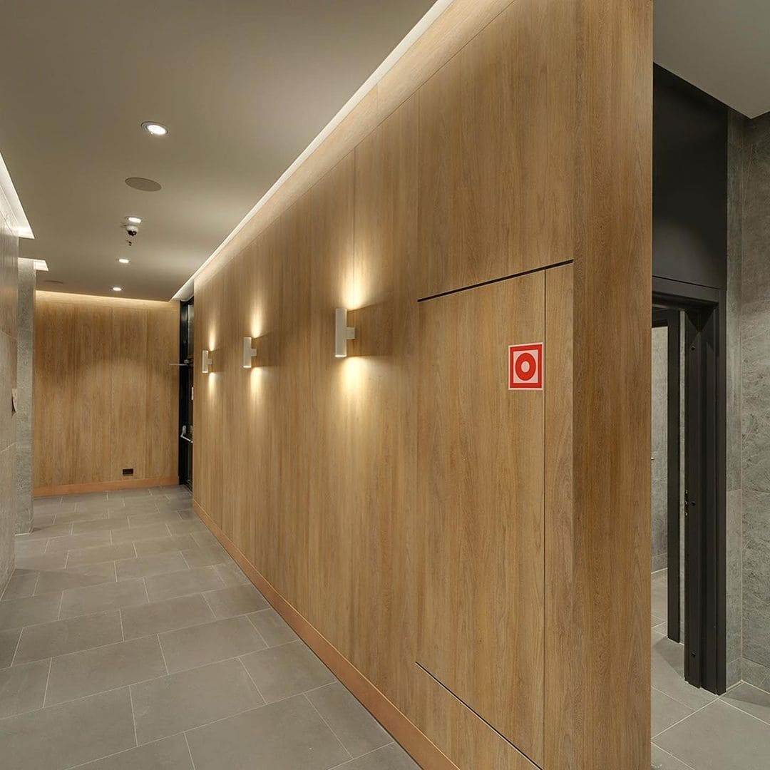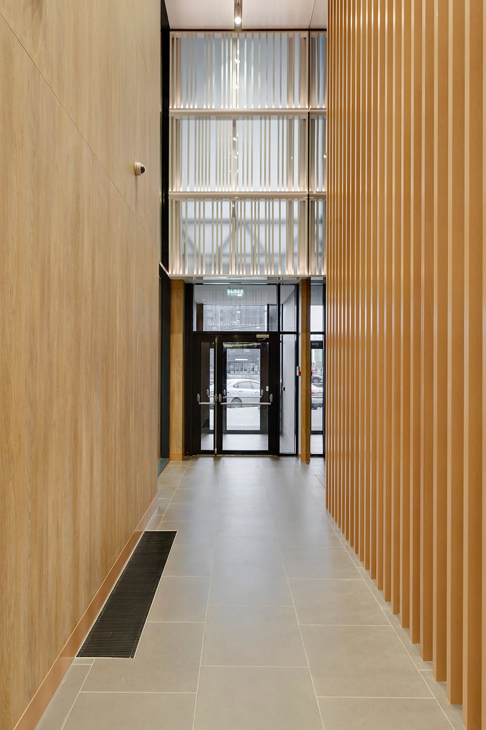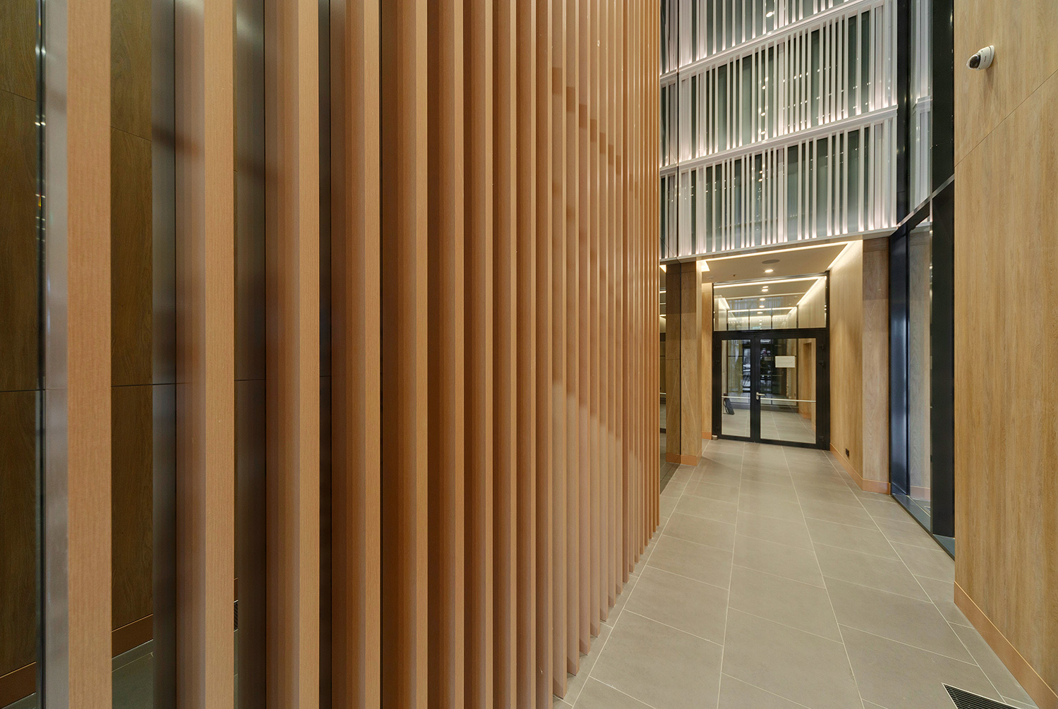 В проекте использовались панели Wallhof HPL™ и рейки Wallhof Rail System™. Лобби - это место большого скопления людей и поэтому должны быть соблюдены требования ПБ КМ-1. Проект интересен своими высотными решениями, которые придают объемность всему залу. В двух местах мы работали на высоте более 6 метров, а именно, при входе в лобби наши панели в три ряда смонтированы на высоте 7,5 метров.