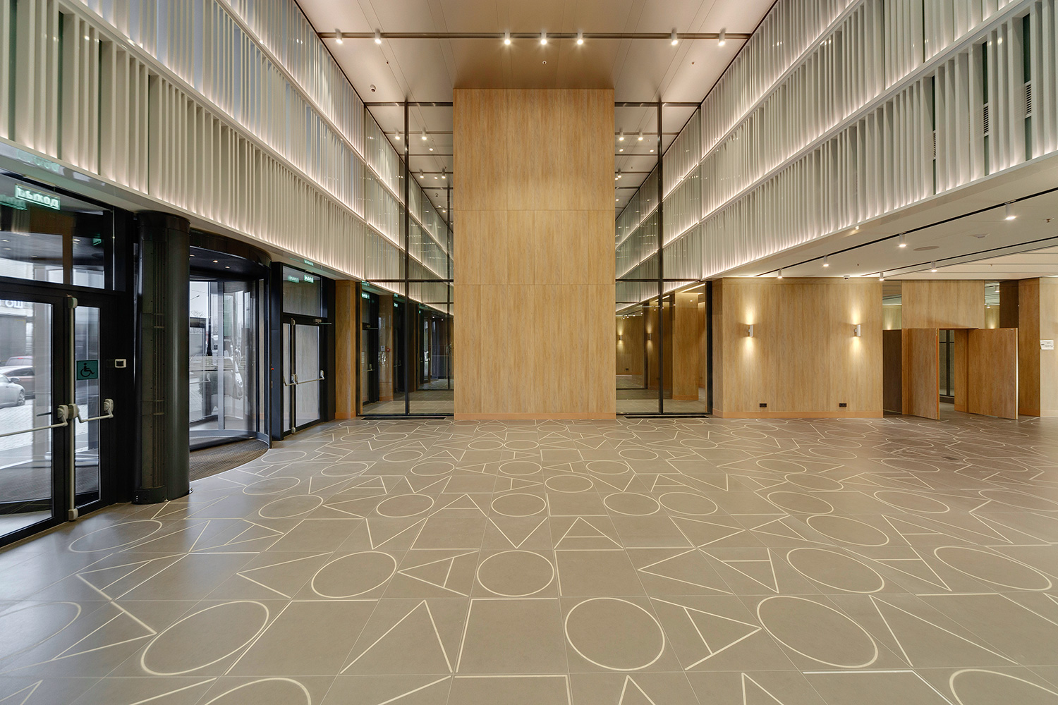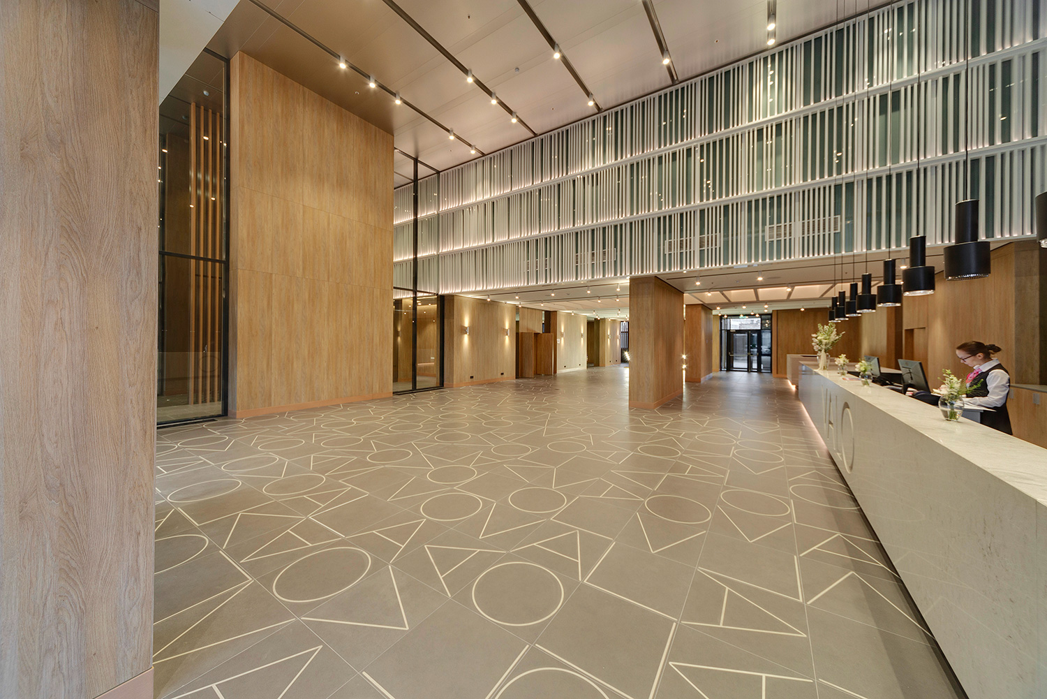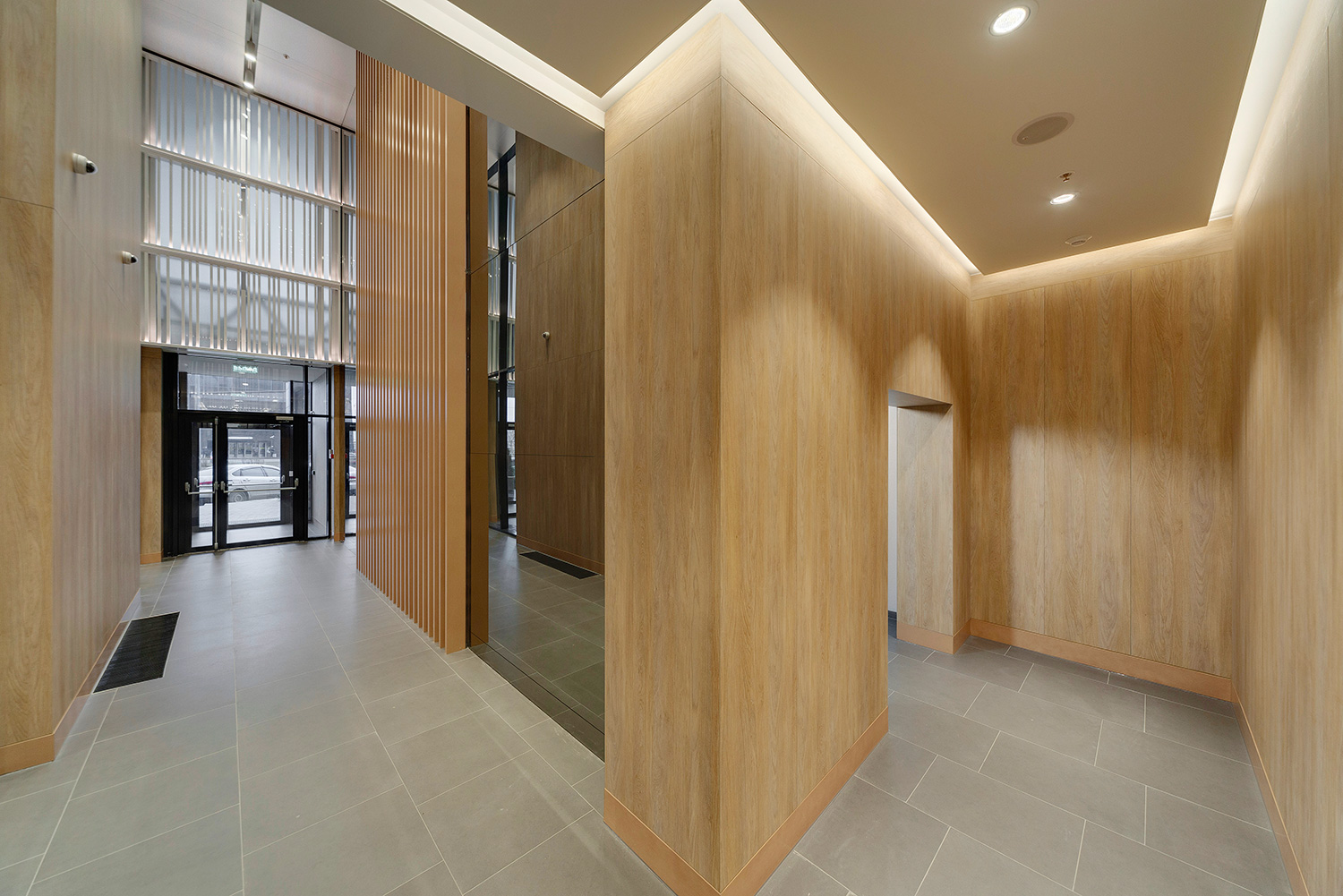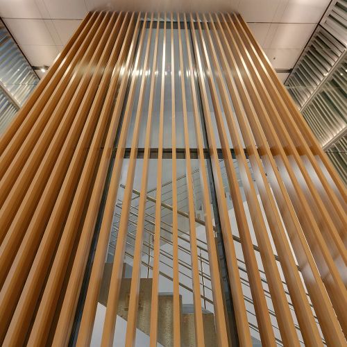 В проекте использовались панели Wallhof HPL™ и рейки Wallhof Rail System™. Лобби - это место большого скопления людей и поэтому должны быть соблюдены требования ПБ КМ-1. Проект интересен своими высотными решениями, которые придают объемность всему залу. В двух местах мы работали на высоте более 6 метров, а именно, при входе в лобби наши панели в три ряда смонтированы на высоте 7,5 метров.