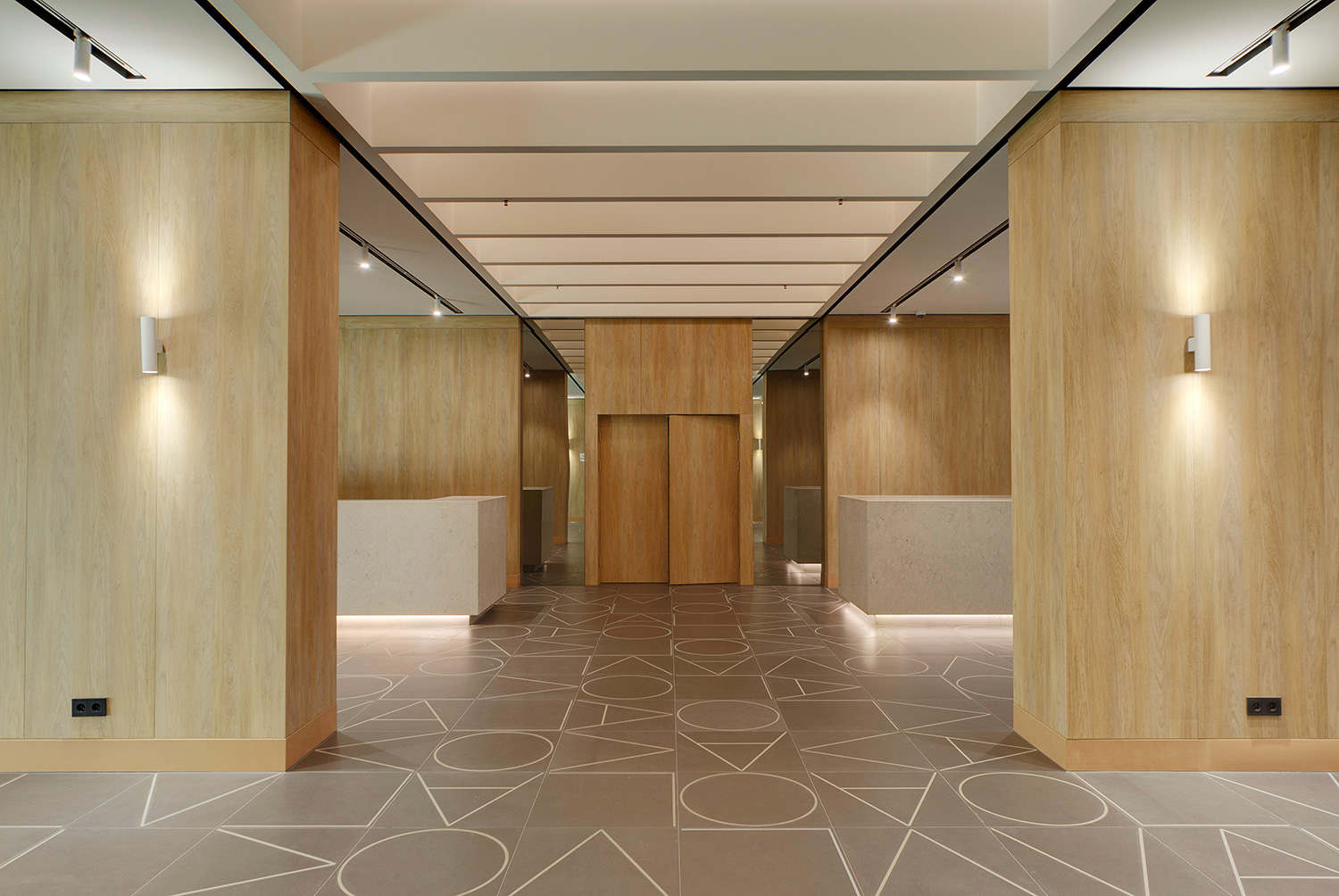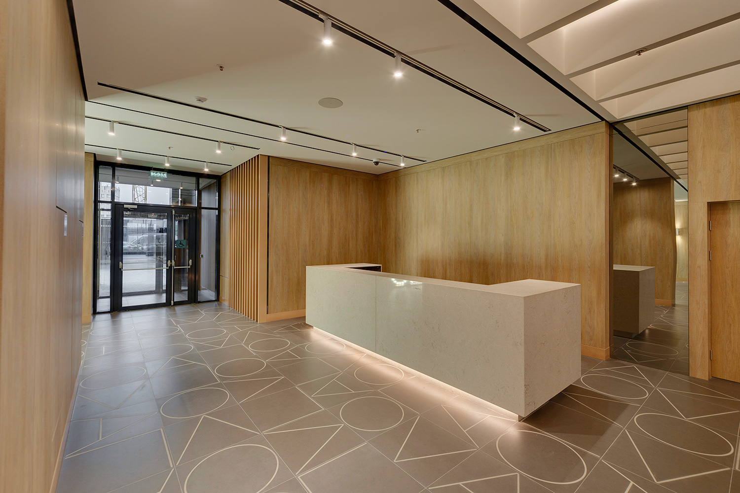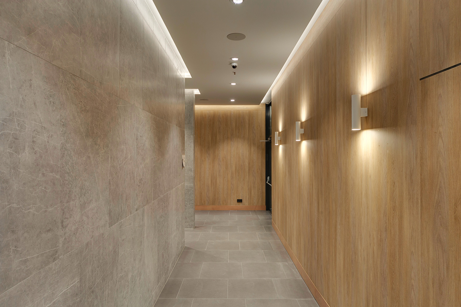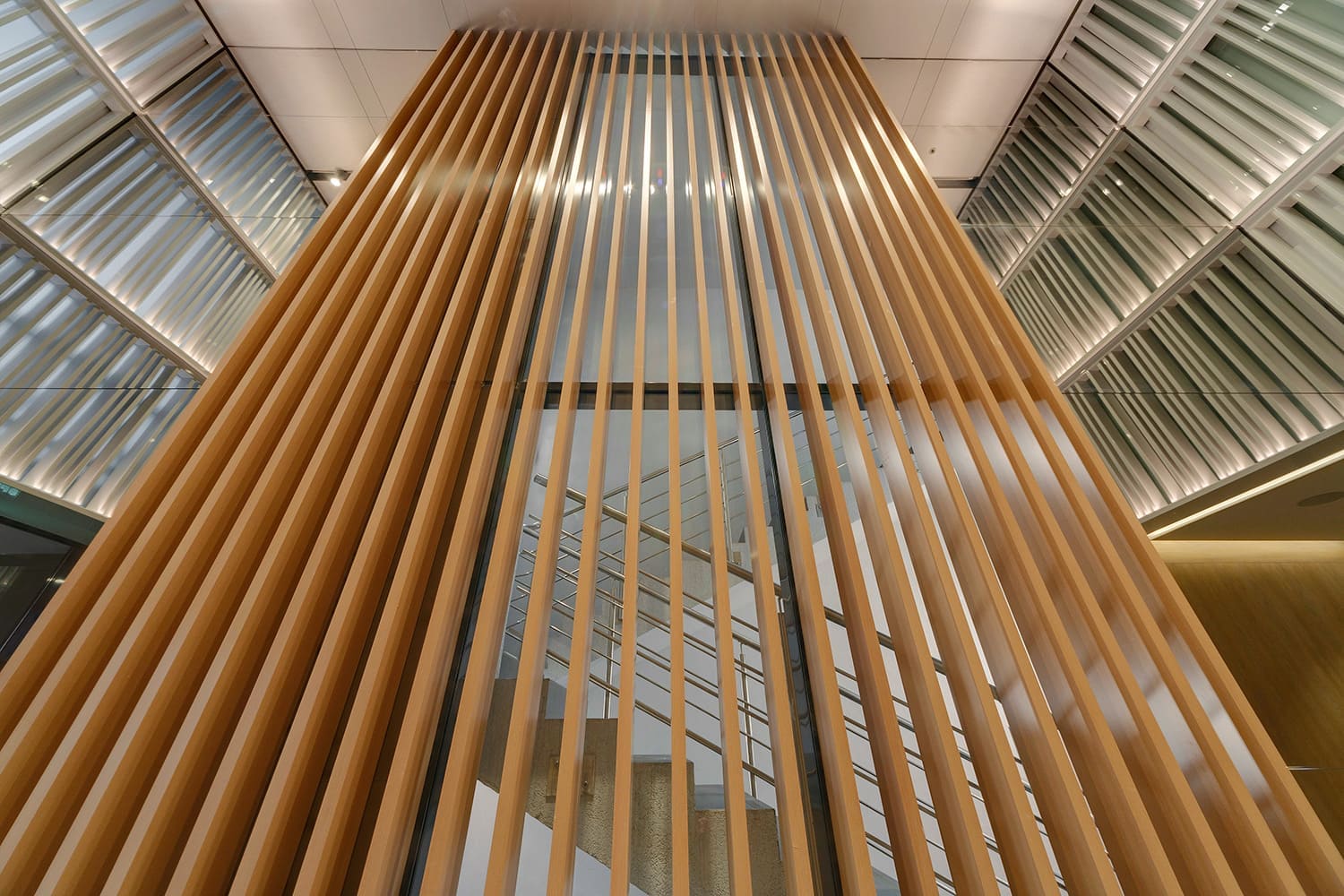 В проекте использовались панели Wallhof HPL™ и рейки Wallhof Rail System™. Лобби - это место большого скопления людей и поэтому должны быть соблюдены требования ПБ КМ-1. Проект интересен своими высотными решениями, которые придают объемность всему залу. В двух местах мы работали на высоте более 6 метров, а именно, при входе в лобби наши панели в три ряда смонтированы на высоте 7,5 метров.