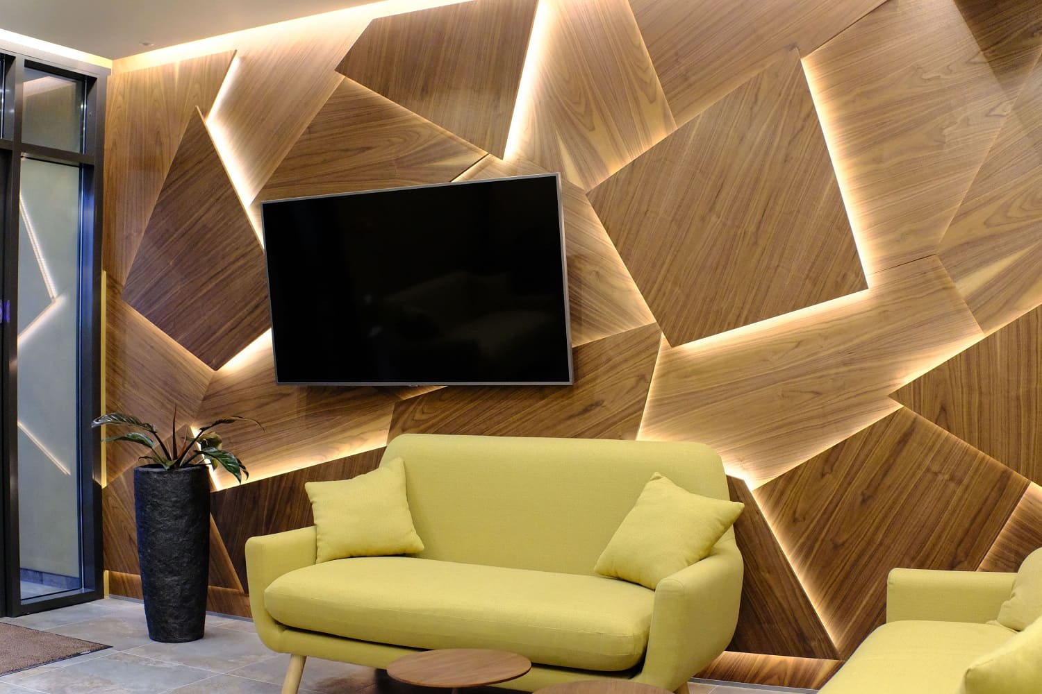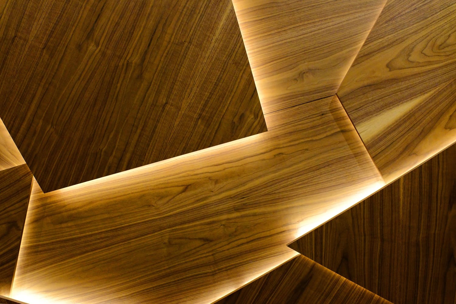 Шпонированные панели Wallhof Wood не правильной формы, смонтированы на разных уровнях, дополнены индивидуальной подсветкой.