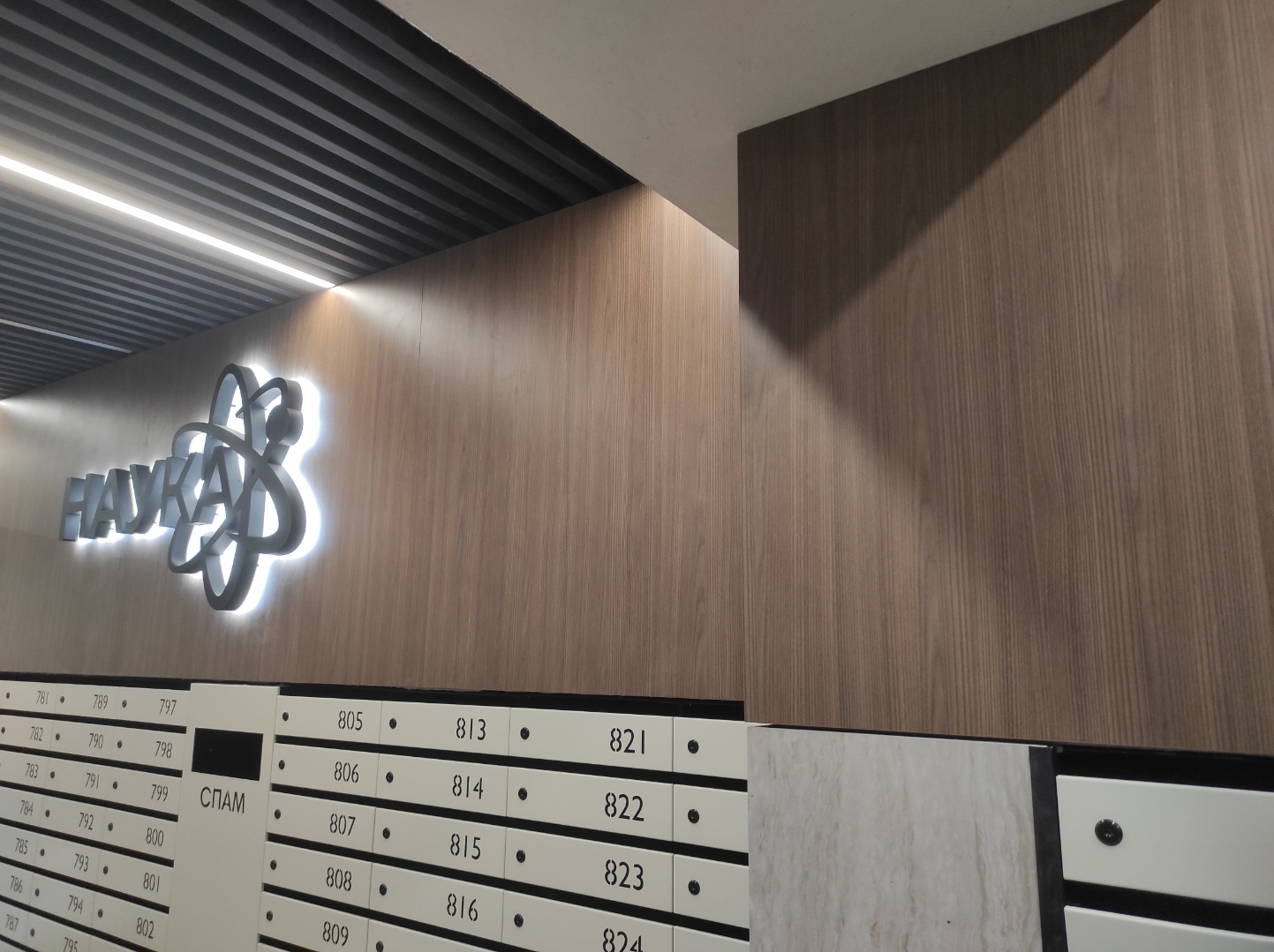 Фабрика Wallhof осуществила разработку монтажных схем, изготовление и монтаж панелей в четырех корпусах жилого комплекса бизнес-класса Наука. В проекте использованы панели с покрытием из HPL, а также рельефные изделия, разработанные специально для этого объекта, покрытые трудногорючей эмалью. Панелями Wallhof отделаны холлы первых этажей, а также все лифтовые зоны типовых этажах.