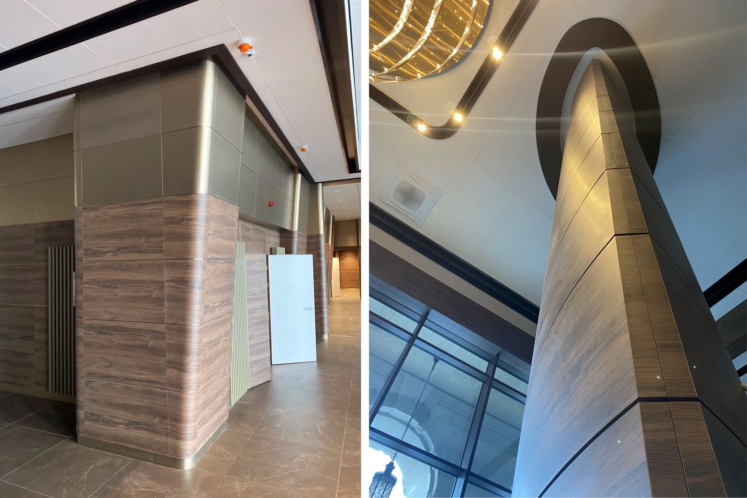 При заказе услуги отделки в компании Wallhof, специалистами выполняется облицовка колонн радиусными панелями под дерево, камень, металл на выбор клиента. Такие панели изготавливаются на заказ по индивидуальным проектам. часто для изготовления радиусных панелей используется ручной труд. Мы используем только качественные материалы с сертификатами огнестойкости (по N 123-ФЗ) и экологичности.